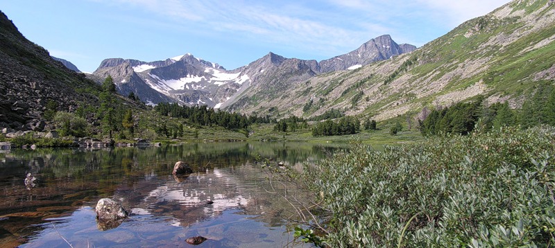 На спуске все очень устали, поэтому до трех часов дня идти даже налегке сил не было. Потом стоящие на ногах пошли гулять к озеру. Вообще силы и способности у участников были очень разные. Я обычно находилась где-то между теми, кто умер весь и больше ничего не может и теми, кто бодро скачет несмотря ни на всё. Это приводило к тому, что на радиальных выходах до конечной точки маршрута мы с Раном не доходили, а останавливались где-то посредине придти в себя и пообщаться с местом. Очень правильно сделали и на сей раз - народ побежал на одно из верхних озер, а мы сидели на берегу большого, а оно стоит того, чтобы посидеть там спокойно и в одиночестве.