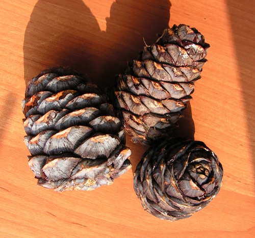 Вообще мне теперь понятно, почему это самые дорогие орехи: шишек очень мало, достать их в общем случае нереально, приходилось довольствоваться тем, что сбросили вниз белки и бурундуки. Они чуть-чуть обгрызали шишку, а мы за ними доедали. Лишь однажды я нашла шишку на маленьком кедре и дотянулась-таки до нее палкой. Смеялись долго: Ран сказал, что я везде себе найду лимон и буду за ним прыгать (привет лимонам из Татопани! :-) И, конечно, вкус кедровых орехов, сорванных с дерева, мало напоминает ту прогорклую гадость, что у нас за мильён продается в магазине.