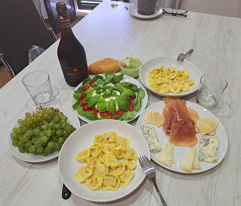 Сыры в Италии — это была отдельная радость. Сверху там на тарелке сыр с трюфелем, который мы купили в маленькой местной лавке. Сыры там хранились без холодильника! То есть это как-то скрепно считается, по-настоящему. Раньше же тоже не было холодильников, но выдержанные сыры в +30 нормально себя чувствуют. Так и этот трюфельный сыр прекрасно себя чувствовал и с удовольствием был съеден.