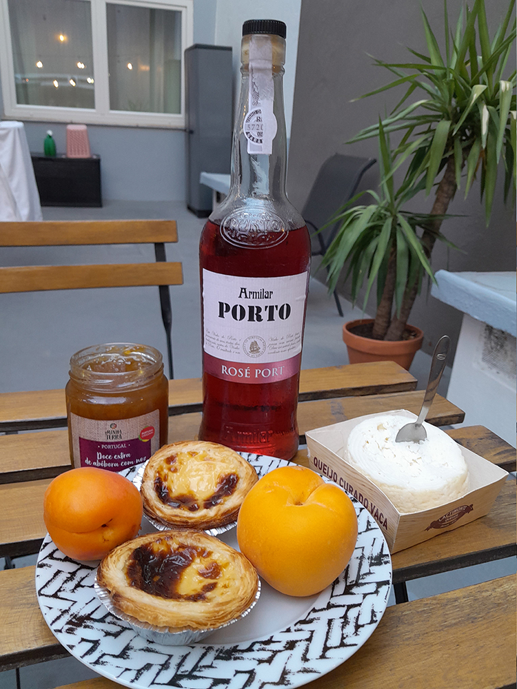 Очень симпатичный розовый портвейн (вы знали, что портвейны бывают розовыми?), сыр был какой-то проходной. На переднем плане паштель де ната. Эти корзиночки — традиционная португальская выпечка с яично-сливочным заварным кремом.