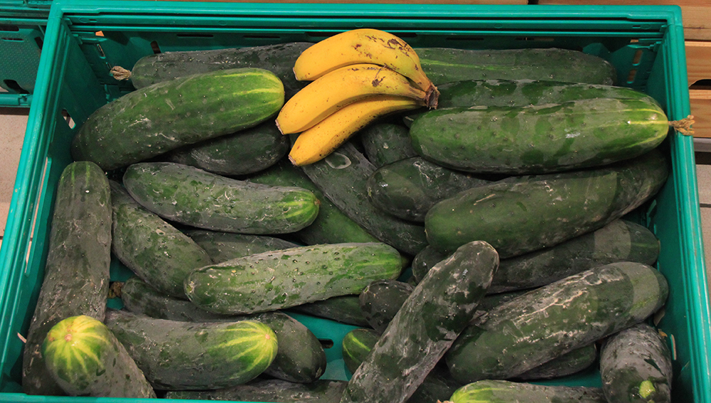 Сравнительные размеры бананов и огурцов.