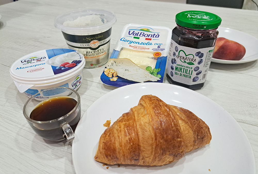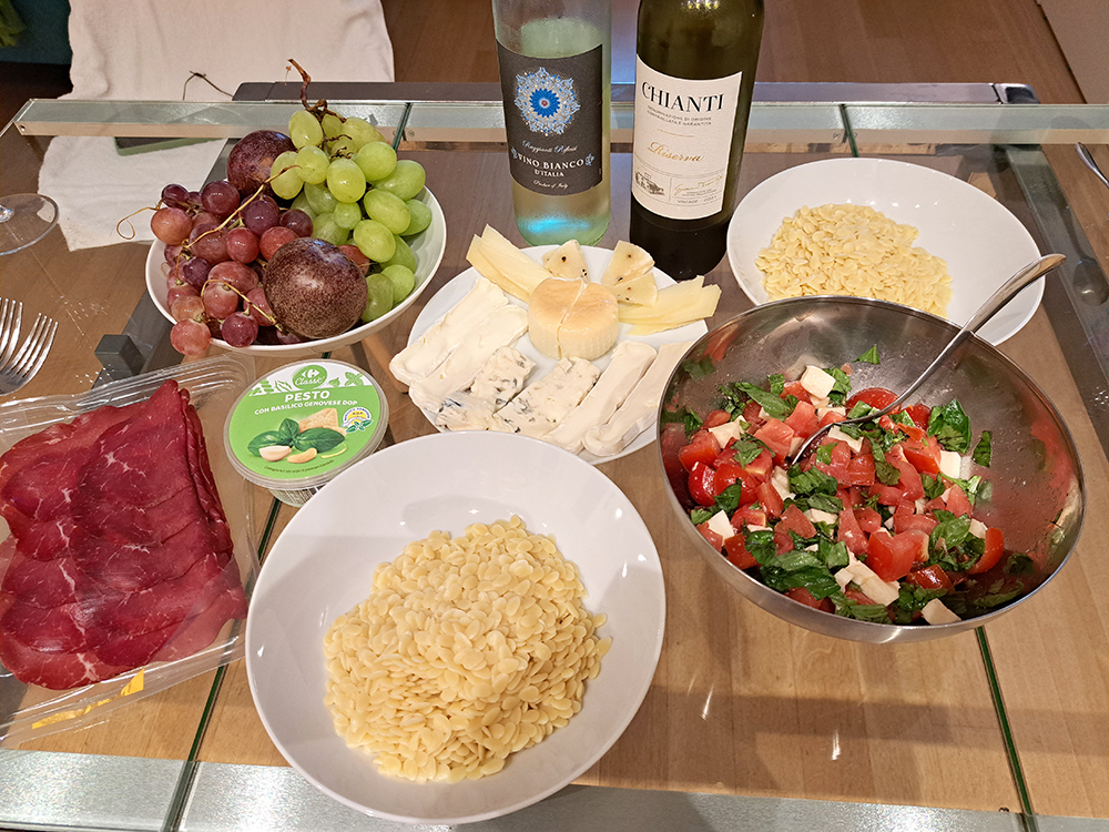 Креветки, моцарелла и свежевыжатый сок пойдут на ужин, а хлеб и мясо составляли наш обеденный перекус. Завтракали мы по большей части творогом, потому что могли его найти. Ведь не в каждой стране это возможно, а мы творог любим. На обед, который всегда был в дороге, мы ели фрукты и хлеб с мясом (нарезкой или честно пожаренным куском мяса накануне). А ужин был полноценный, с основным блюдом, салатом, сыром и вином. А потом с чаем и выпечкой.