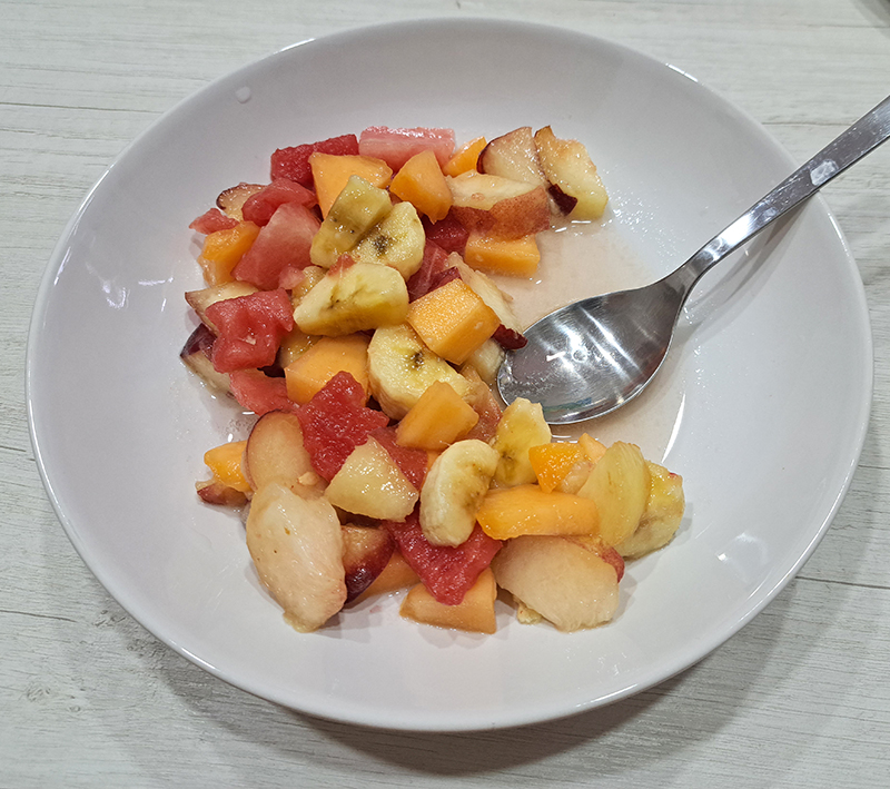 Фруктовый салат из пяти видов мягких фруктов заливали вином — столовым или игристым.