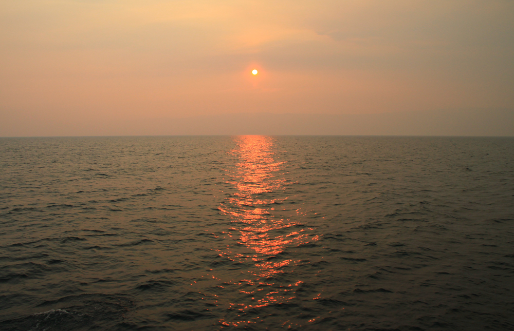 Теплоход «Баргузин» — эта такая водная маршрутка. Он может остановиться по требованию в тех бухтах, которые не заявлены в официальном расписании, люди заходят не только с рюкзаками-велосипедами-байдарками, но иногда с мотоциклами и крупным рогатым скотом. Поэтому вместо заявленных в расписании одиннадцати часов мы шли четырнадцать. Это тяжело, потому что при выходе в открытое море качка бывает серьезной: нос теплохода подлетает, а потом свободно падает на метр-полтора, все последствия за свой счет. Мы сидели возле багажного отсека, и, когда рюкзаки с чемоданами разлетались в разные стороны, приходилось их подбирать. Я как-то терпела эту качку, Ран через некоторое время пошел наверх на корму остужаться. И поэтому у нас есть немного фотографий :-)