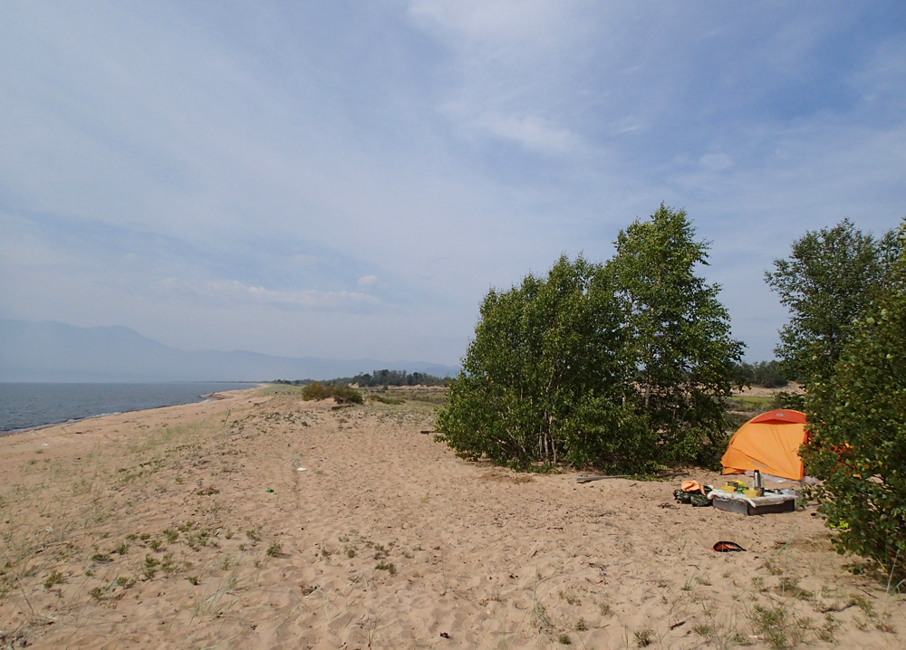 Защиты от ветра тут тоже не было, как и больших деревьев, чтобы подвесить еду. Но за палаткой росла голубика, на маленьком кедре я нашла пару молодых шишек, а на следующий день сторож из рыбачьей артели, расположенной неподалеку, принес нам рыбу.