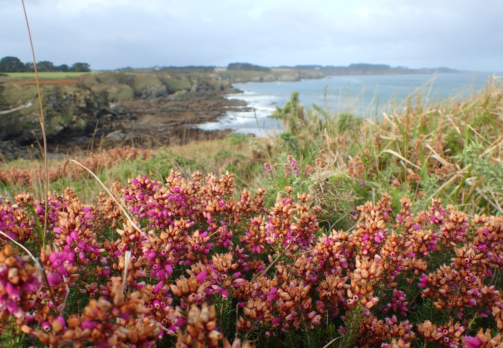 В конце тропы вышли к пустынным и ветреным берегам. Тут пастбища, вереск и утесы.