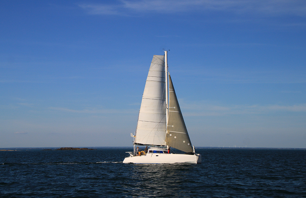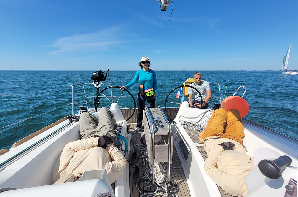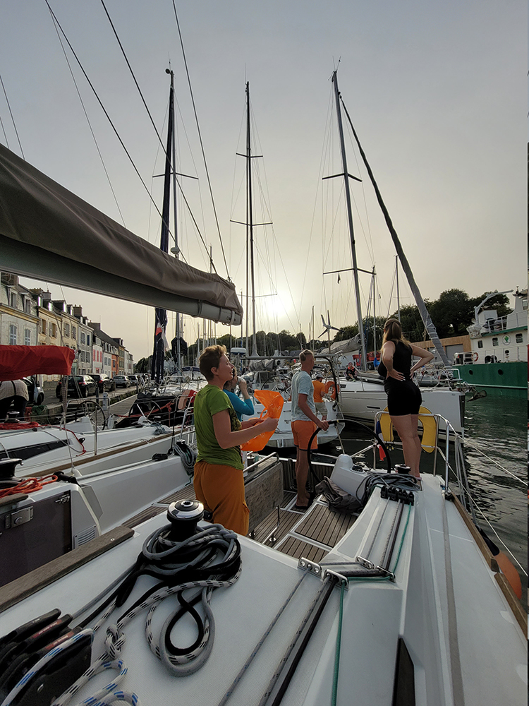 2 сентября мы из Нанта добирались до нашей яхты, которая стояла в городке Трините-сюр-Мер. Вернее, яхт было две и шли они параллельно. Всё было не быстро, приехали мы в Трините уже ближе к вечеру. К тому времени наши капитаны были на месте и принимали яхты у чартерной компании. Мы как-то закупили еды и обжились. Оля с Лёшей, которые тоже были в нашей команде и еще собирались учиться на яхтмастеров, вовремя не прилетели. Добрались они лишь на следующее утро: их самолет, летевший в Париж из Осло, развернулся посреди дороги обратно из-за поломки, пришлось добираться с пересадками, через Милан, с ночным автобусом из Парижа...