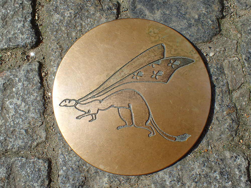 Городской символ, попадающийся на мостовых — горностай в мантии с лилиями.