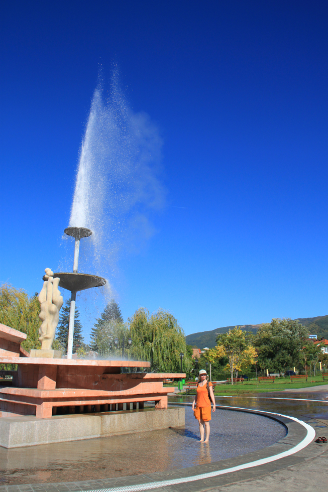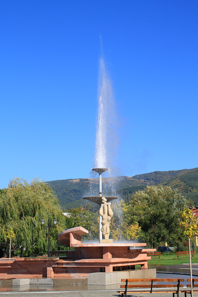 Посреди маленького города Сапарева баня есть парк, который разбили вокруг гейзера. А гейзер оформлен как фонтан, и каждые 15–20 секунд из этого фонтана бьет струя горячей воды. Пахнет сероводородом, все как положено. Мы его видели накануне в темноте, решили полюбоваться днем.