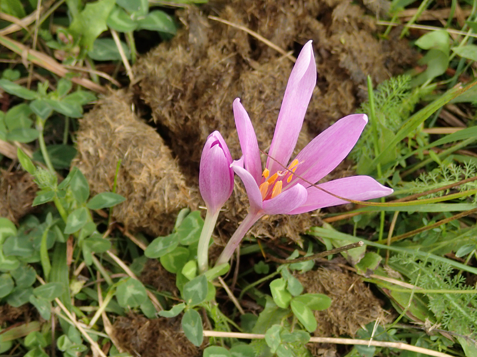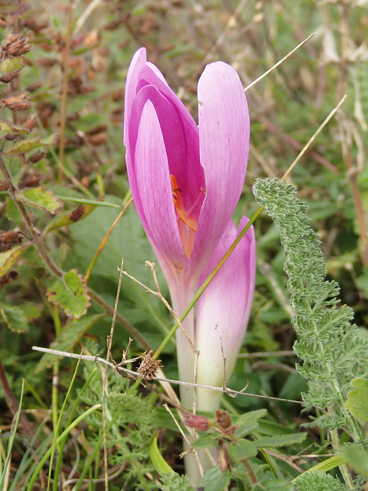 Сверху растут безвременники, но ветер такой, что их достаточно трудно снимать. Цветы очень нежные, ветер их треплет и ломает.