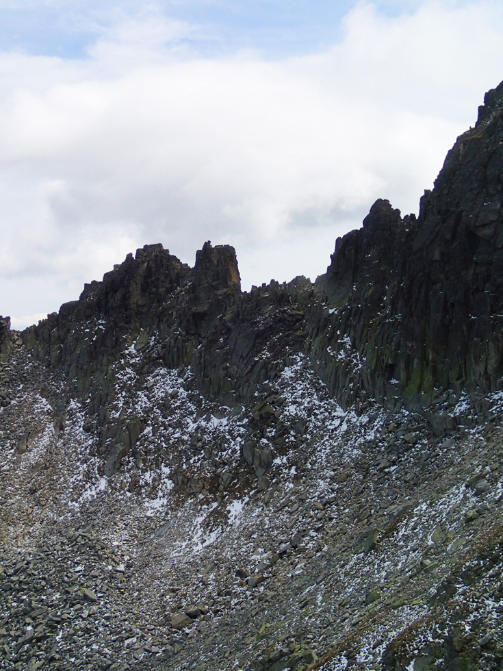 Нам на ту гряду. Она кажется страшной, однако справа по камням проложена удобная тропинка. Путь технически простой, наверное потому, что на пике стоит метеостанция и туда в свое время пришлось поднимать много грузов.