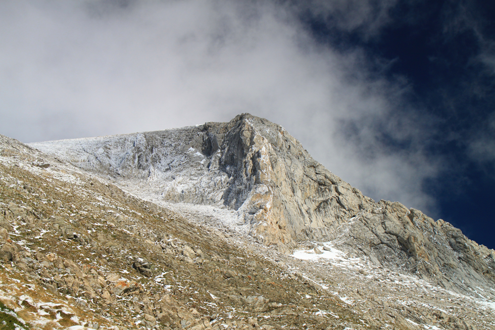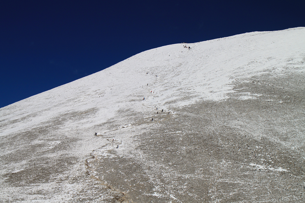 На спуске сильно не хватало кошек. Ну хотя бы маленьких, карманных, которые так пригодились нам полтора года назад на Торонг Ла. Потому что под снегом на верхней части пика — мраморная крошка. Шла я, скользила, висела на палках и бухтела: почему, почему вся снаряга (кроме палок) лежит дома?!