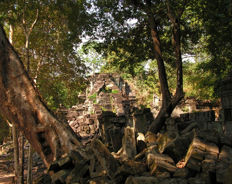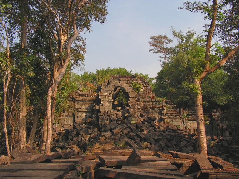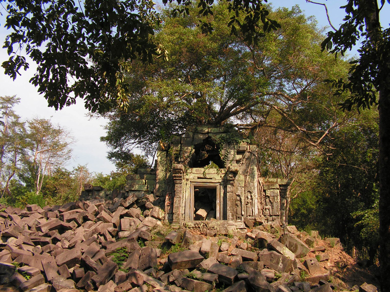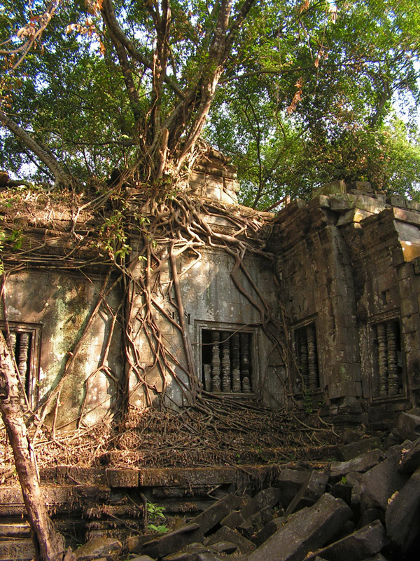 В 15 веке кхмерское государство (или королевство) ослабло и под натиском соседей-тайцев сдало Ангкор, переехав на восток. О храмах не то чтобы забыли, там жили немногочисленные буддийские монахи. Но многое порушили люди, да и лес постарался. Деревянных домиков для подданных не осталось, а вот каменные храмы и бассейны с водой частично сохранились.