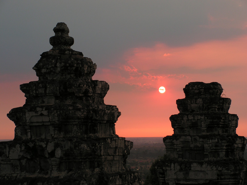 Объехав за день малый круг, я устремилась к холму, на котором стоит храм Пном Бакенг. Там принято встречать закат. Я думала, что хоть оттуда можно посмотреть на Ангкор Ват целиком, но не тут-то было - храм скрыт деревьями. А вот солнце постаралось и закатилось очень красиво.