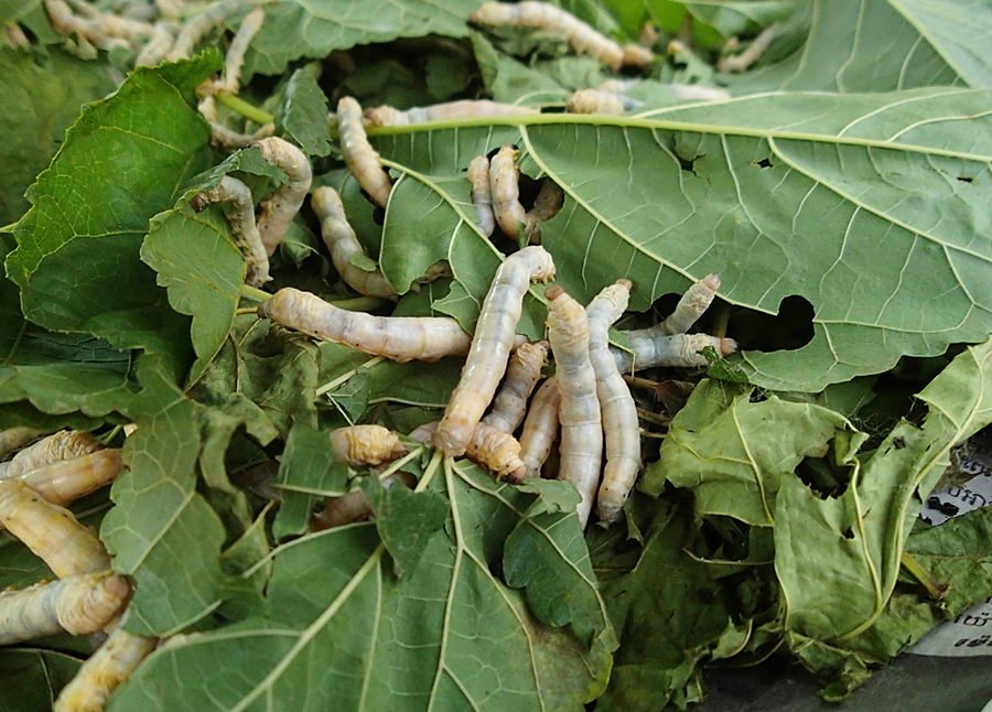 Коконы кидают в кипяток, нитка начинает распускаться, ее накручивают на бобину. А вареных гусениц вылавливают и складывают в корзинку.