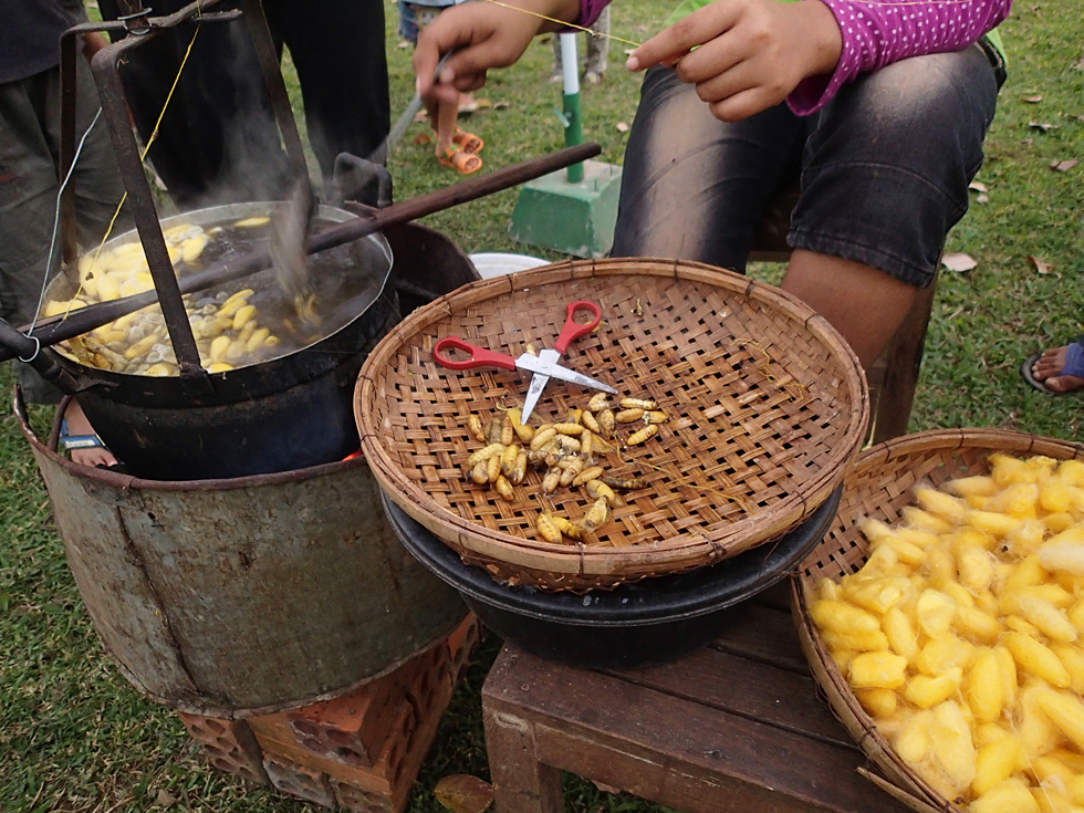 Когда собралось достаточно народа, она предложила закусить и окружающим. На глаза ей попался Ран и она протянула ему гусеницу. Народ притих. Ран с каменным лицом продегустировал гусеницу. На мой вопрос «ну? ну как?» ответил, что эта гораздо вкуснее тех жареных бамбуковых гусениц, которые мы ели возле Ват Ронг Кхун. Ну, тут и я потребовала дегустации, и действительно — очень даже вкусно. Похоже на нежную вареную кукурузу. Хотя сперва несешь ее ко рту и... хм... сомневаешься...