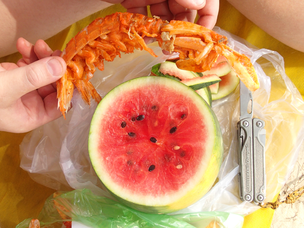 Отведали гигантских креветок, а может, и лангустов. Их нам не представили, просто несли по пляжу и предложили купить за 1,5$ штучка.