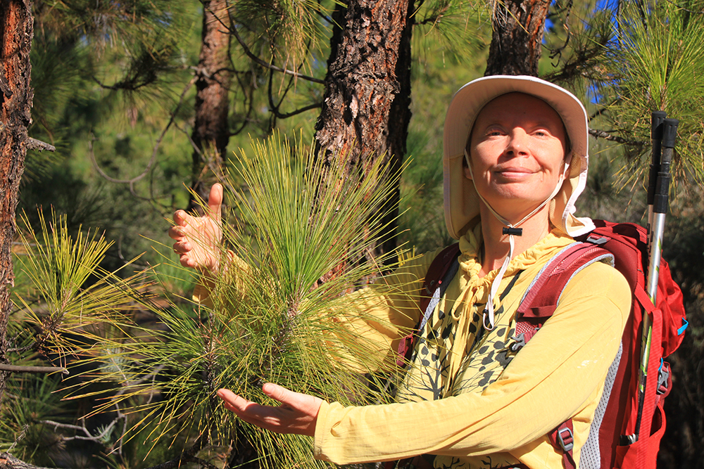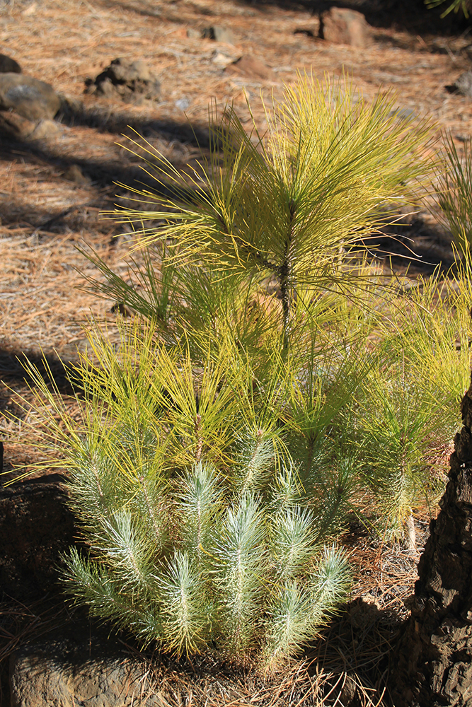 Канарские сосны — удивительные деревья. Хвоя у них меняет цвет. Молодые побеги голубого цвета, а потом они зеленеют.