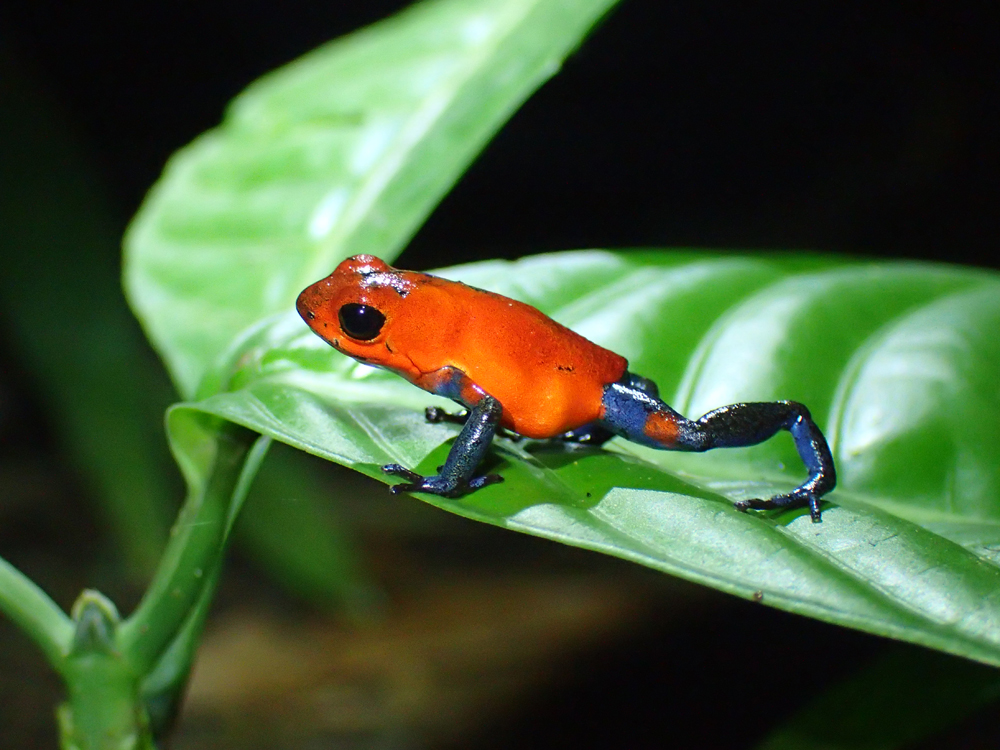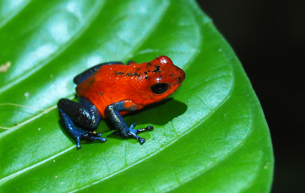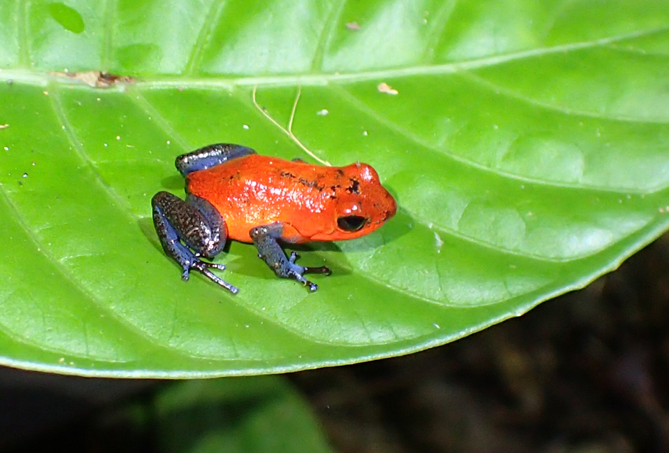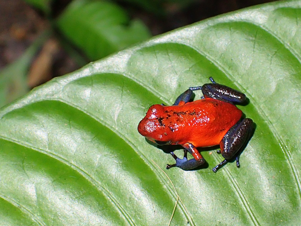 Это небольшая, но очень эффектная лягушка по-русски называется маленький древолаз, по-английски strawberry poison frog (лат. Oophaga pumilio).