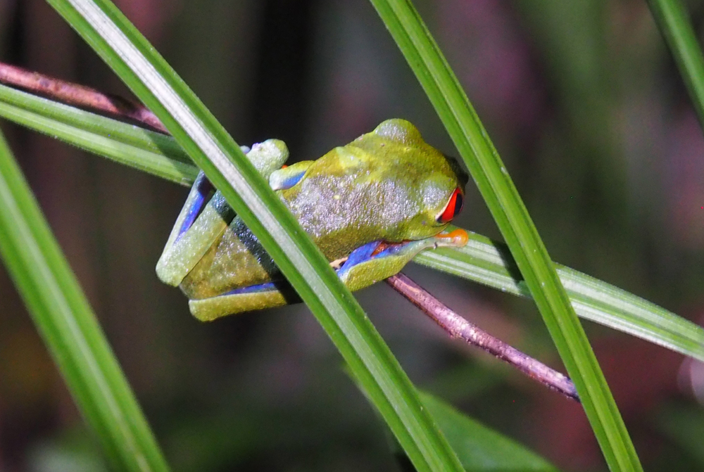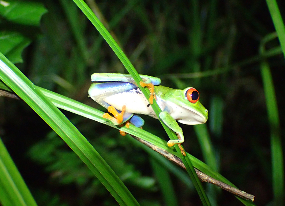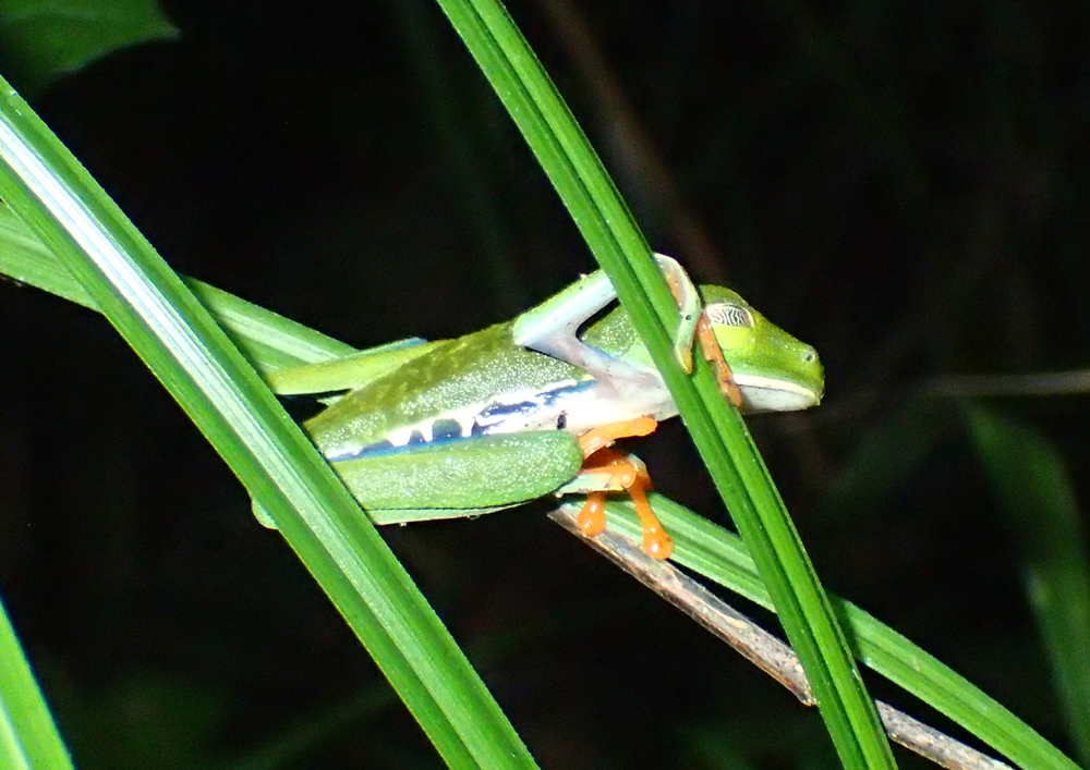 Это красноглазая квакша или red-eyed leaf frog (Agalychnis callidryas). И она уже собралась спать вот в таком «подвешенном» состоянии.
