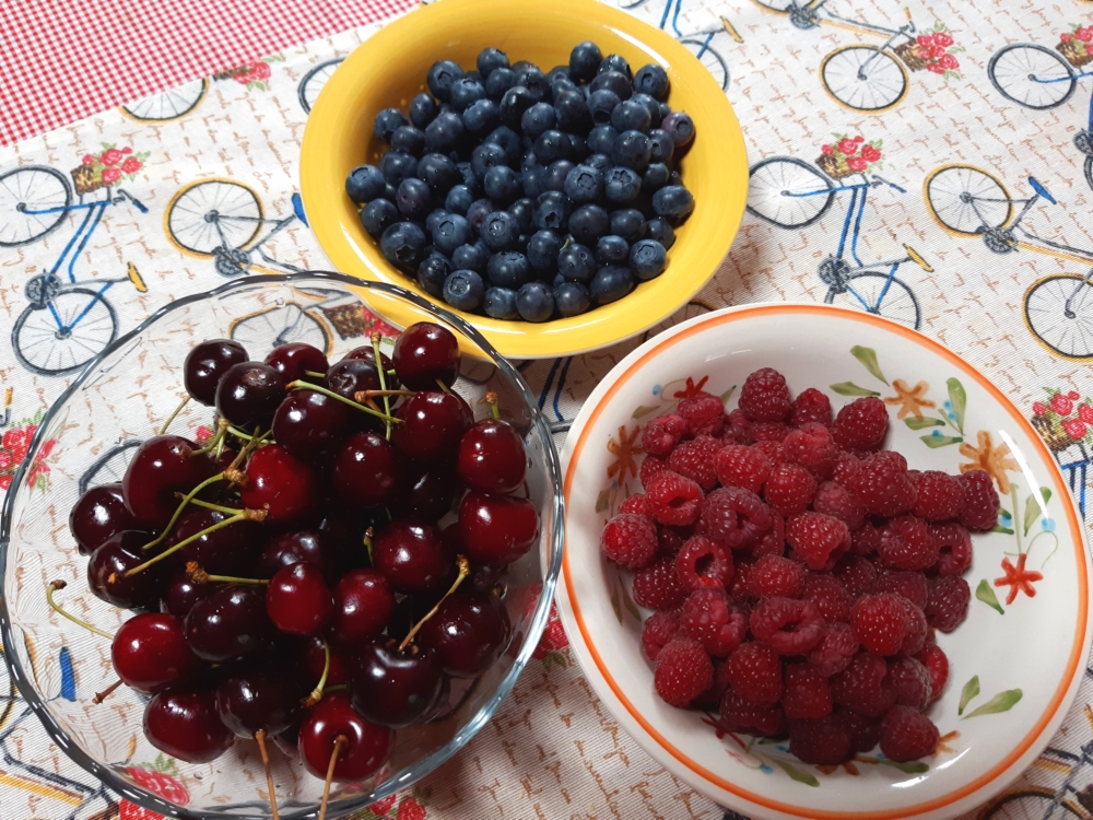 Интересно, что все они прямо тут и растут: сверху на дереве черешня, снизу на кустах голубика.