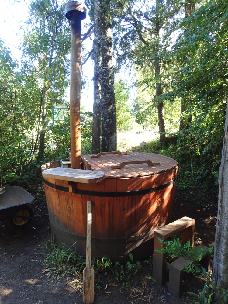 Диаметр у нее около двух метров, под крышкой вода, а сбоку дровяная печь, которая нагревает воду. Почему-то никто, кроме меня, не рвался ее испытать, поэтому она так и простояла без дела. Теперь жалею об этом, было бы чуть больше сил и времени — обязательно бы завела ее.