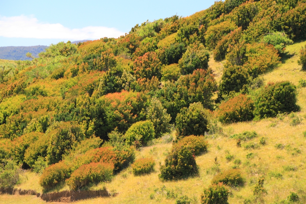 На склонах очень интересные цветные кусты. Одни почти совсем черные, другие с красными побегами.