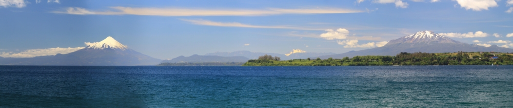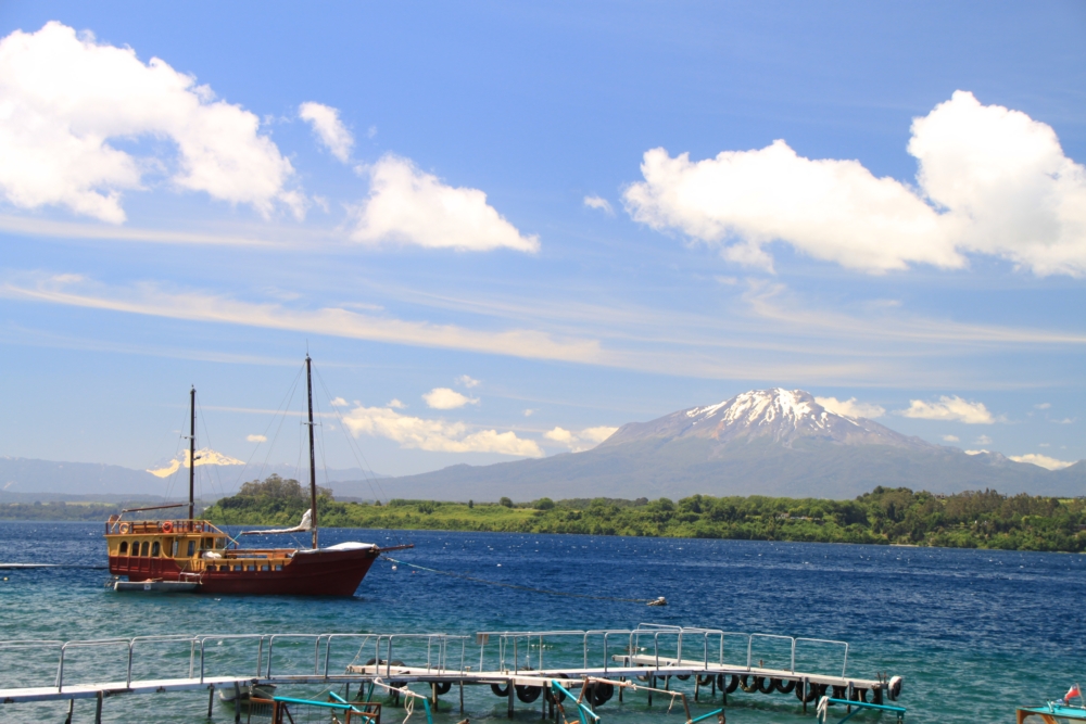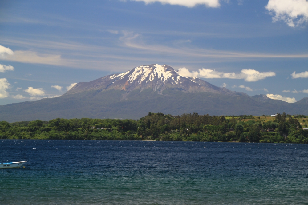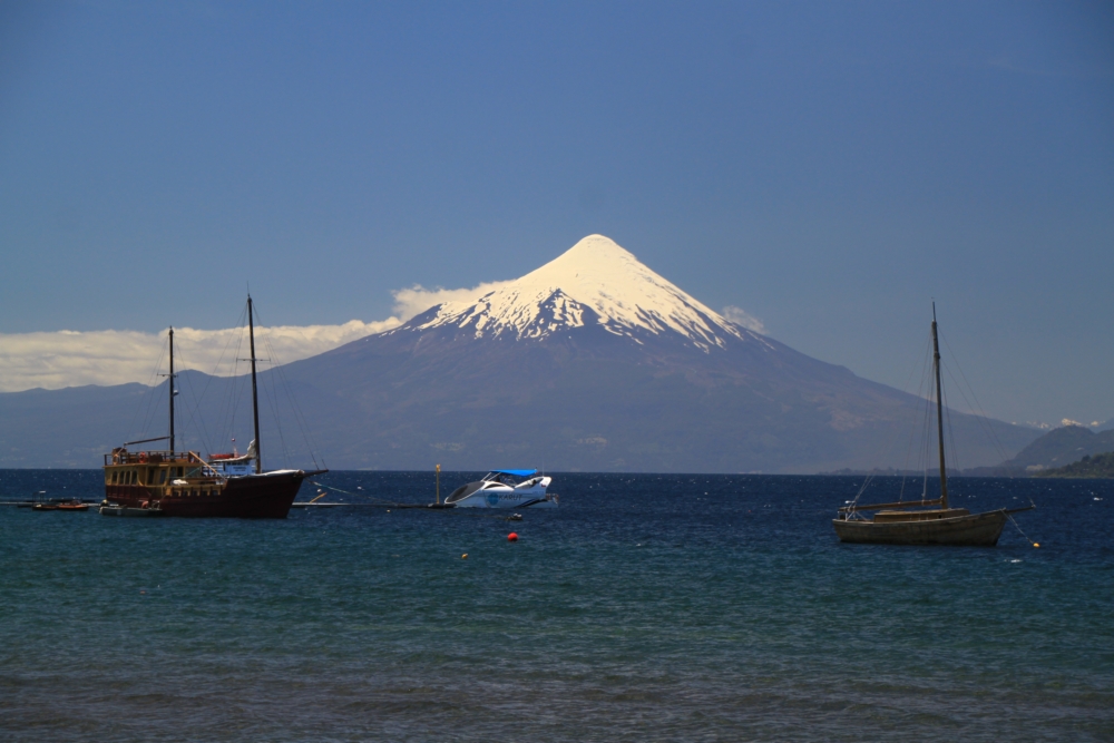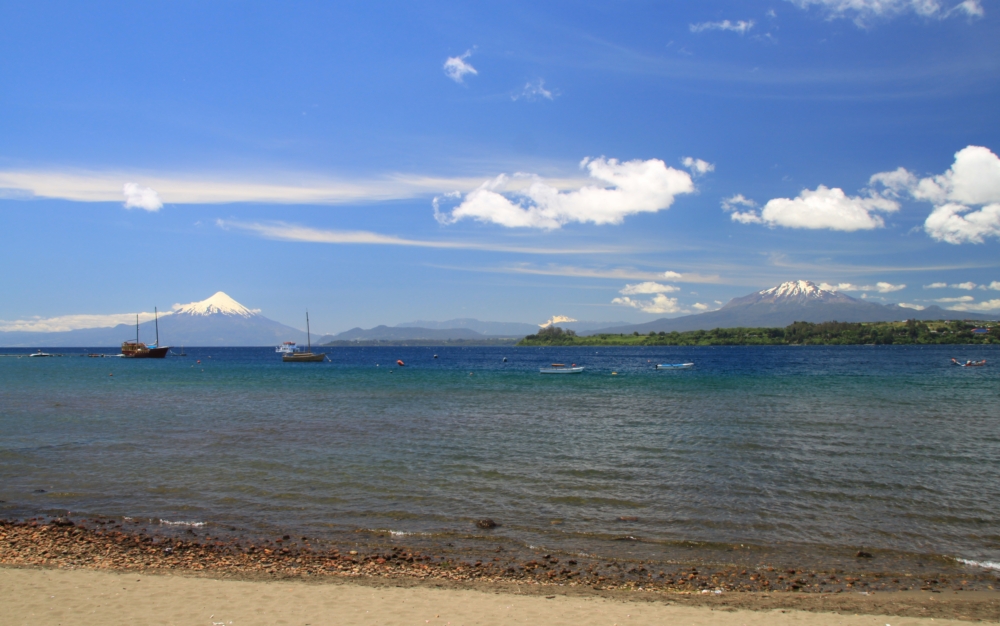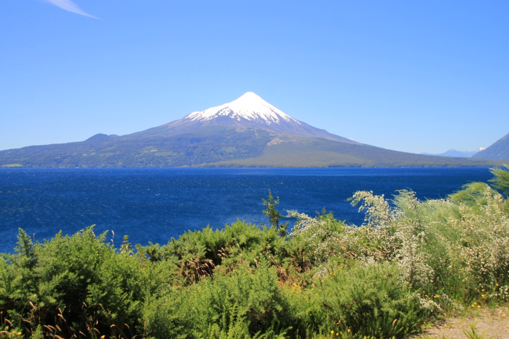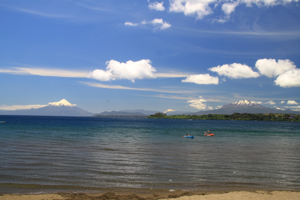 Пока мы ехали к Пуэрто Варасу, облака разошлись. На фоне озера Льянкауэ вулканы смотрятся очень эффектно.