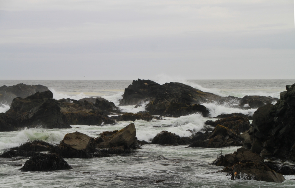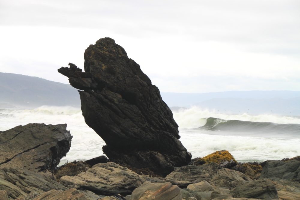 Прибой довольно сильный, вода с серым отливом, а вот камни интересные.