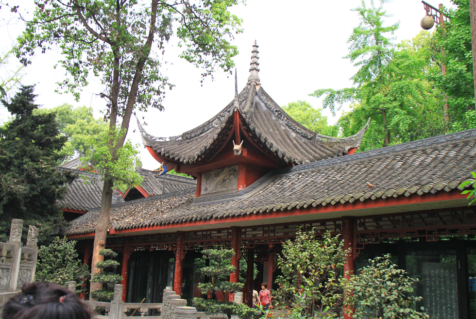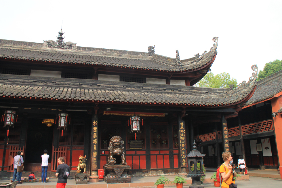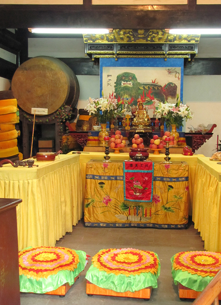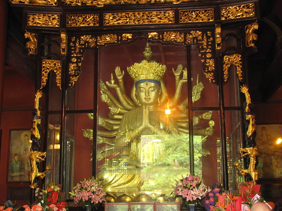 Вот, например: боддхисаттва Авалокитешвара в китайской традиции изображается богиней милосердия Гуаньинь. А тут какой-то переходный этап — статуя изображает Авалокитешвару, а изображения на стенах — Гуаньинь.