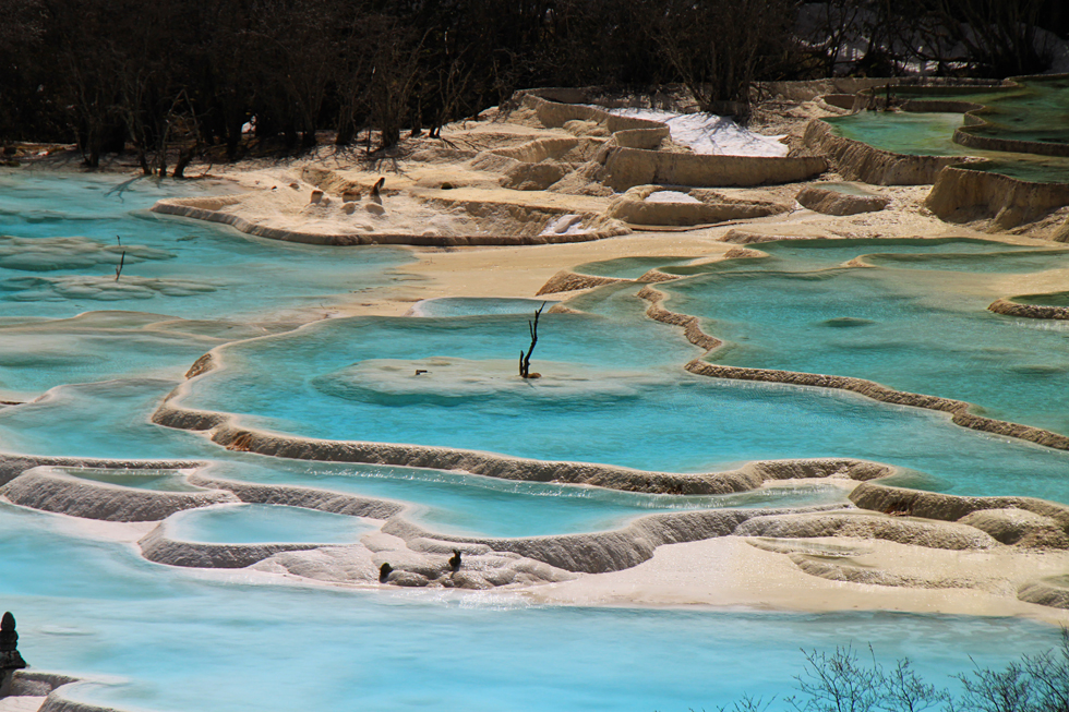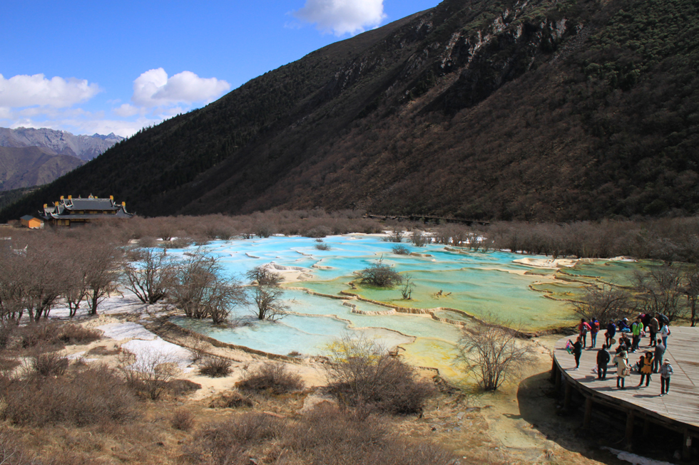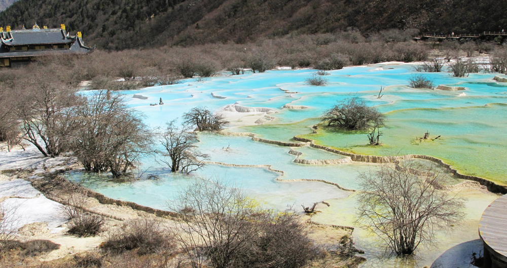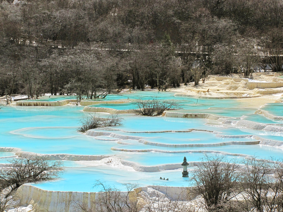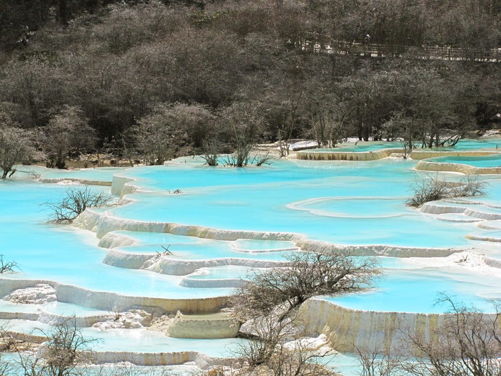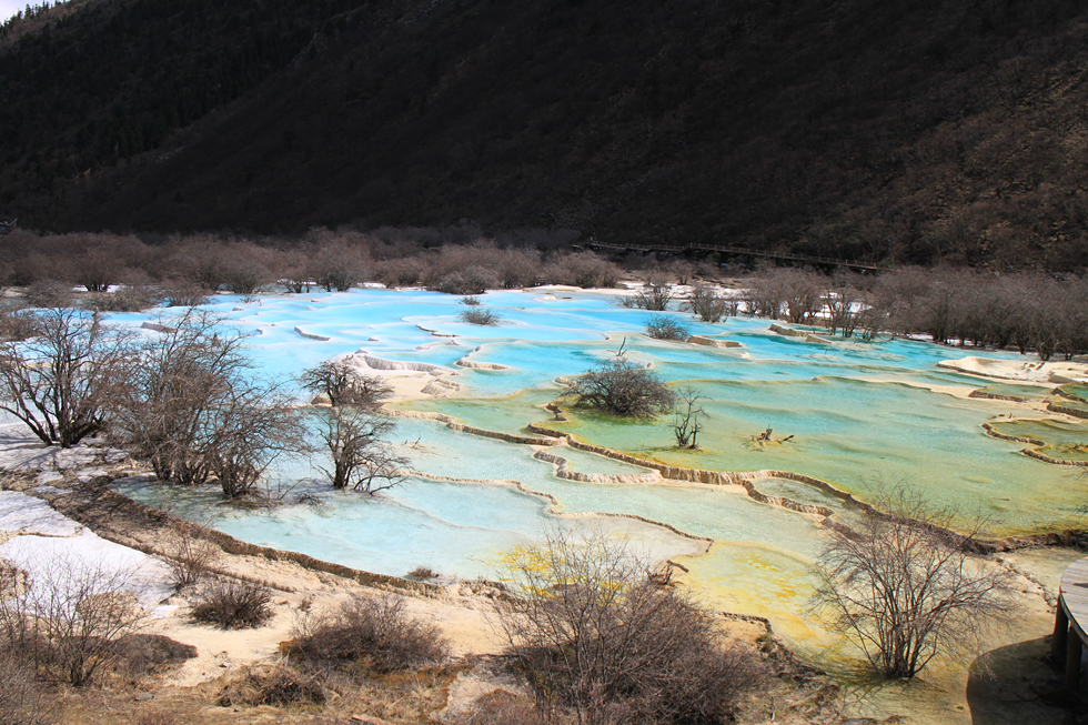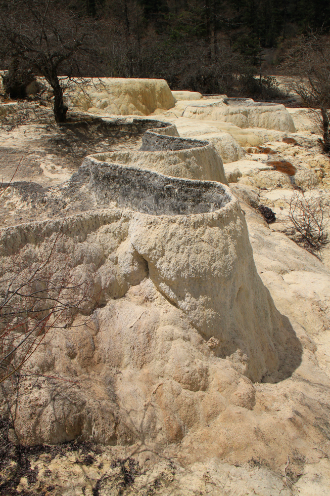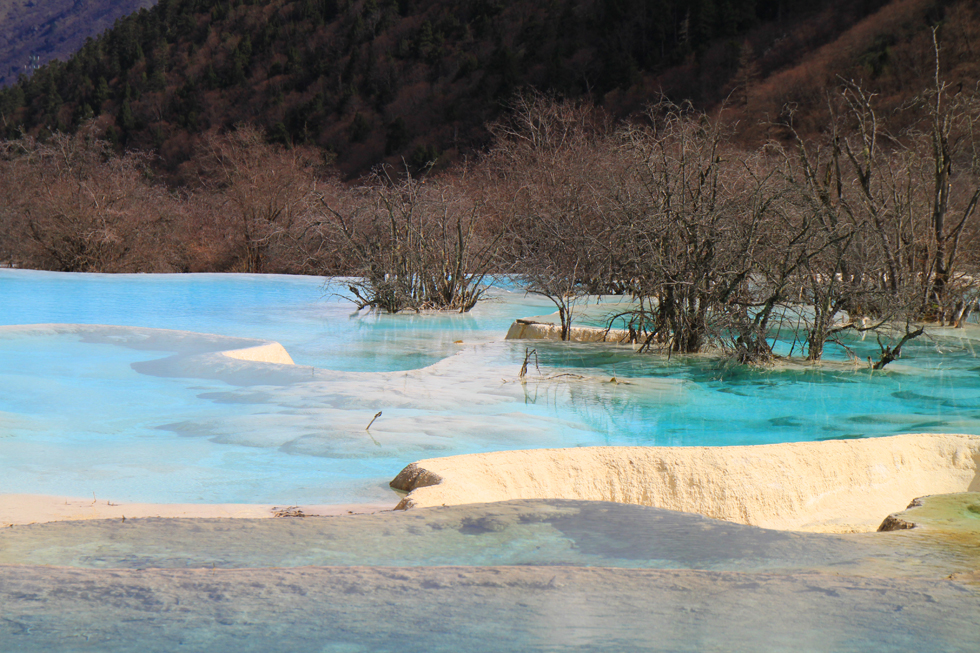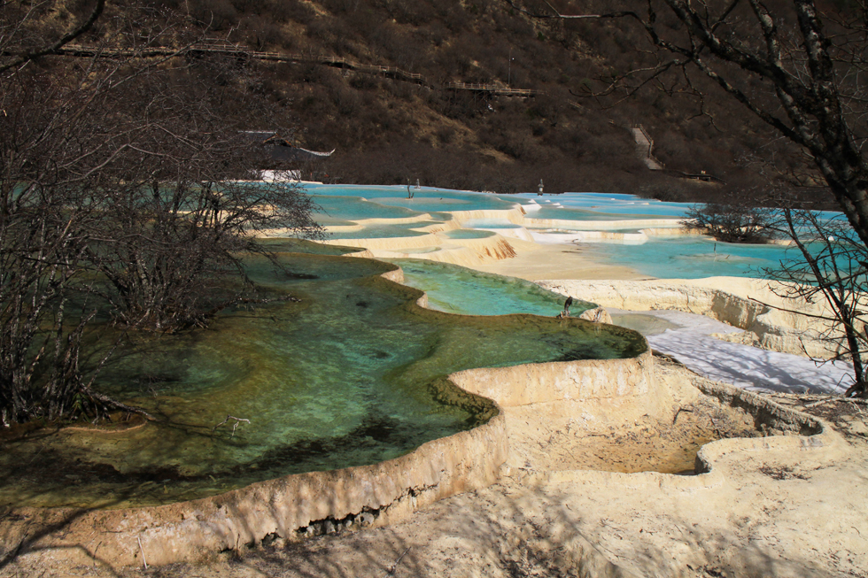 Вдалеке видны пустые травертиновые ванны, они все бледно-желтого цвета. Сверху река, наверное, выглядит как чешуйчатый дракон, поэтому долина называется Хуанлун, Желтый дракон.