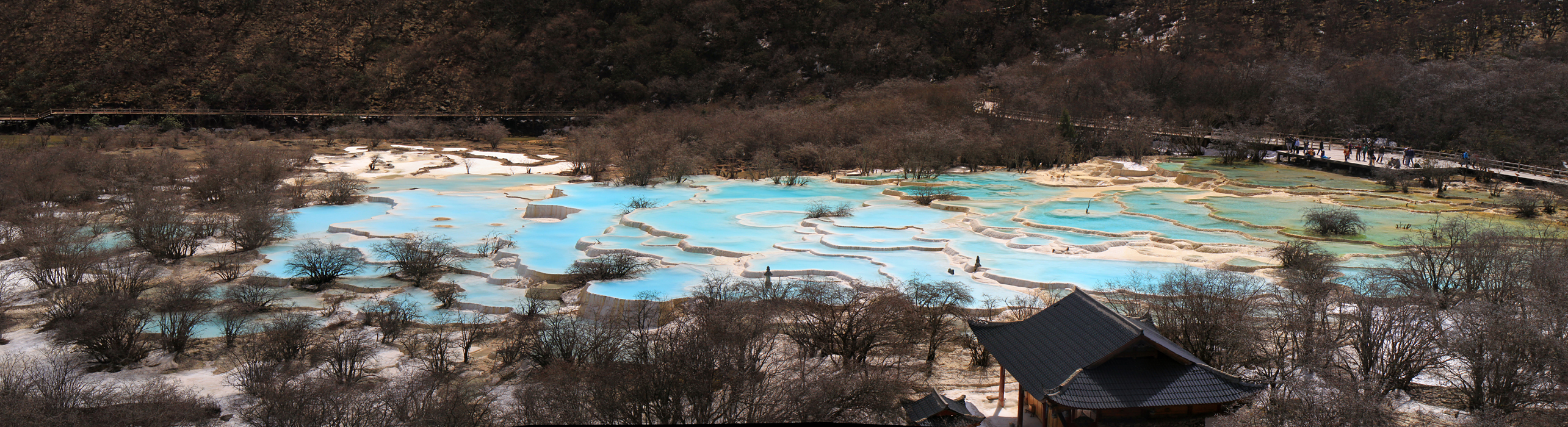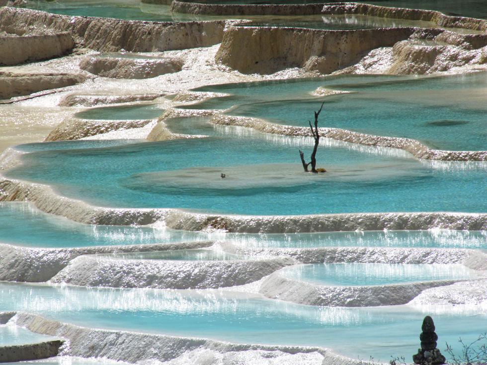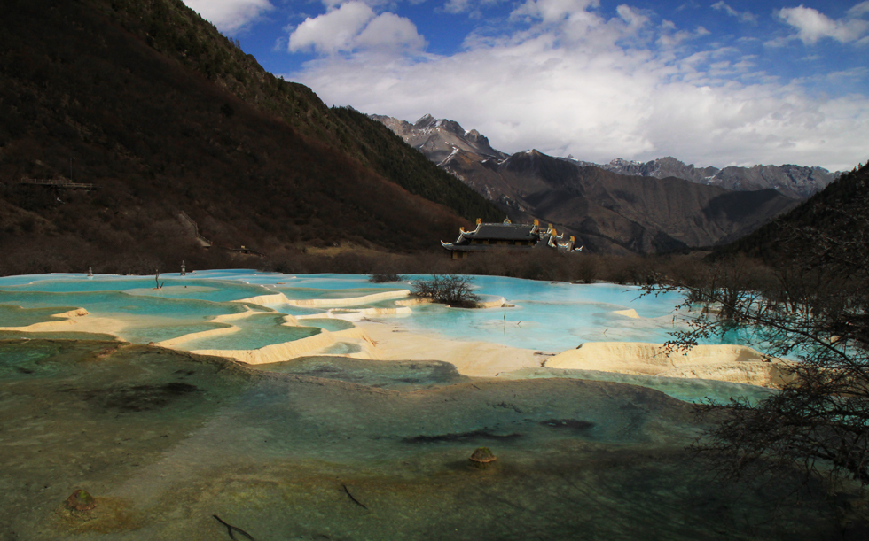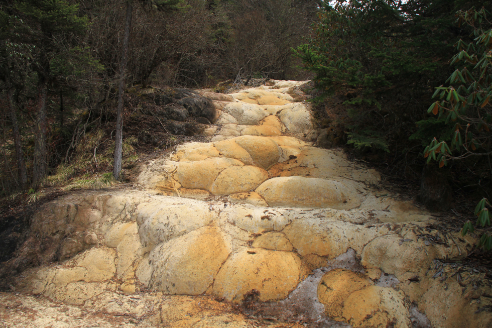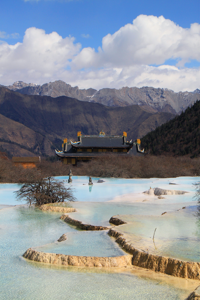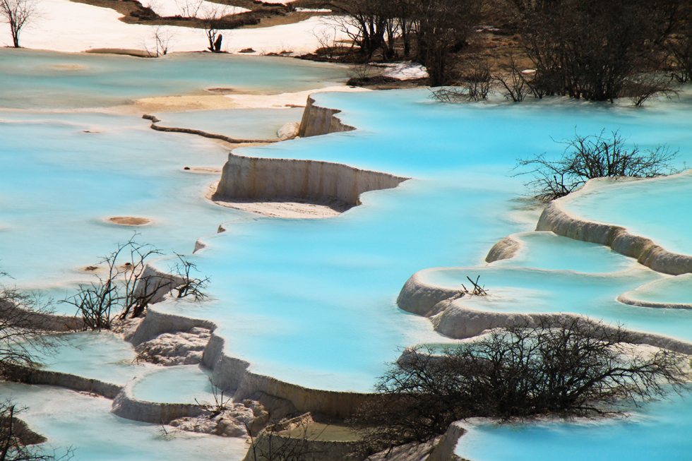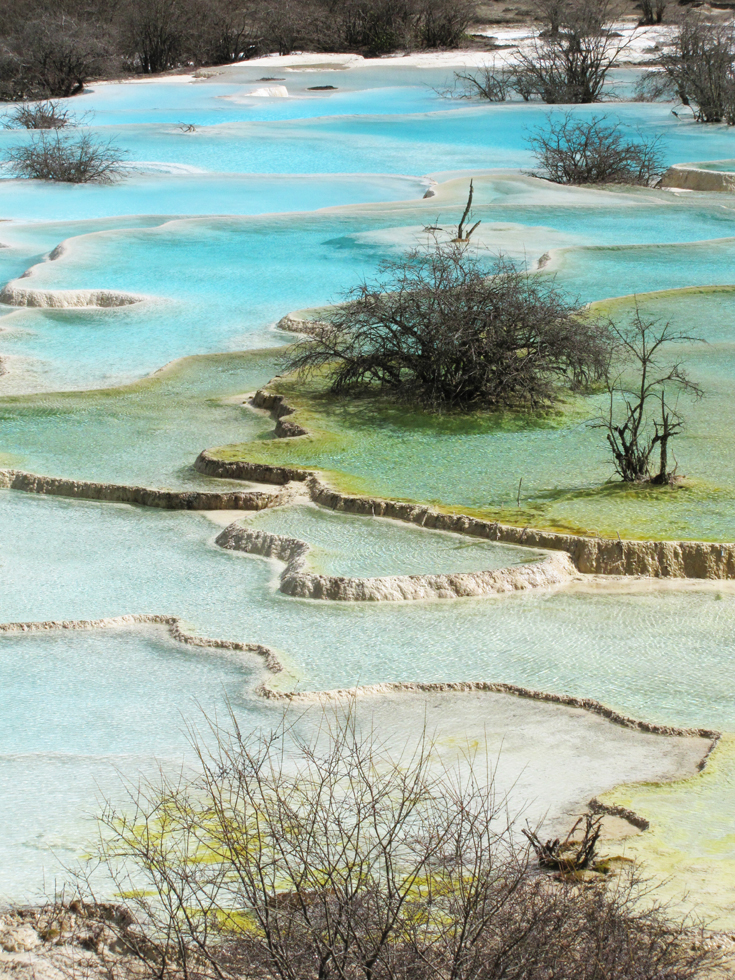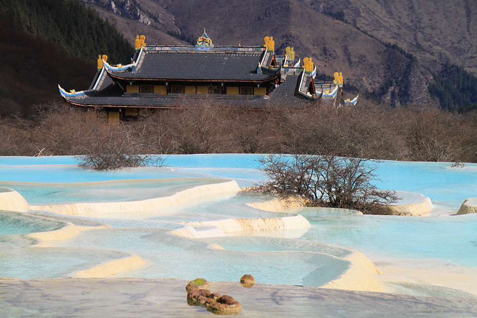 Вдалеке видны пустые травертиновые ванны, они все бледно-желтого цвета. Сверху река, наверное, выглядит как чешуйчатый дракон, поэтому долина называется Хуанлун, Желтый дракон.