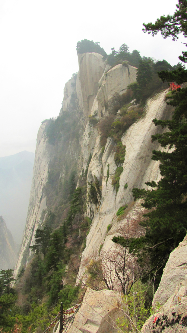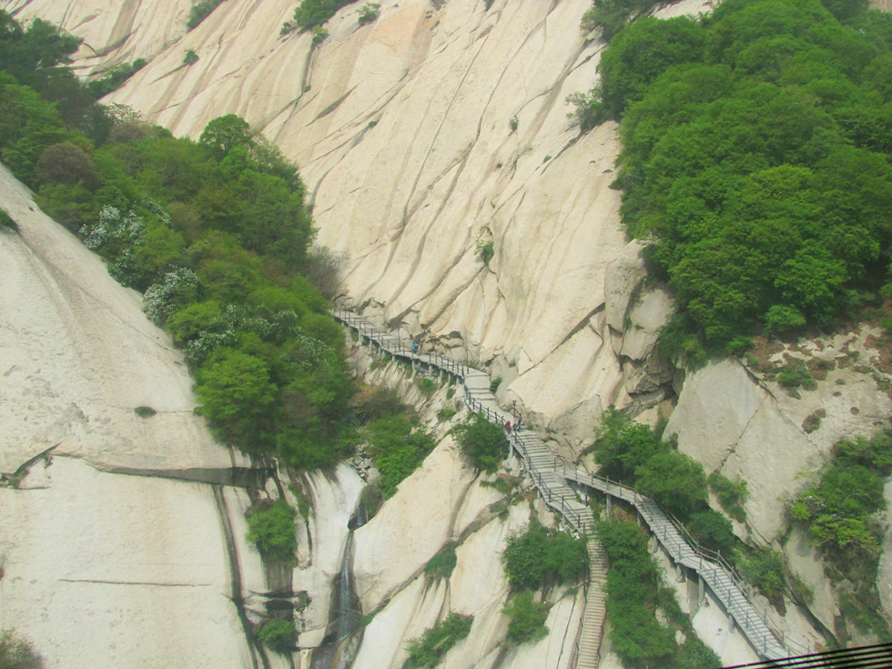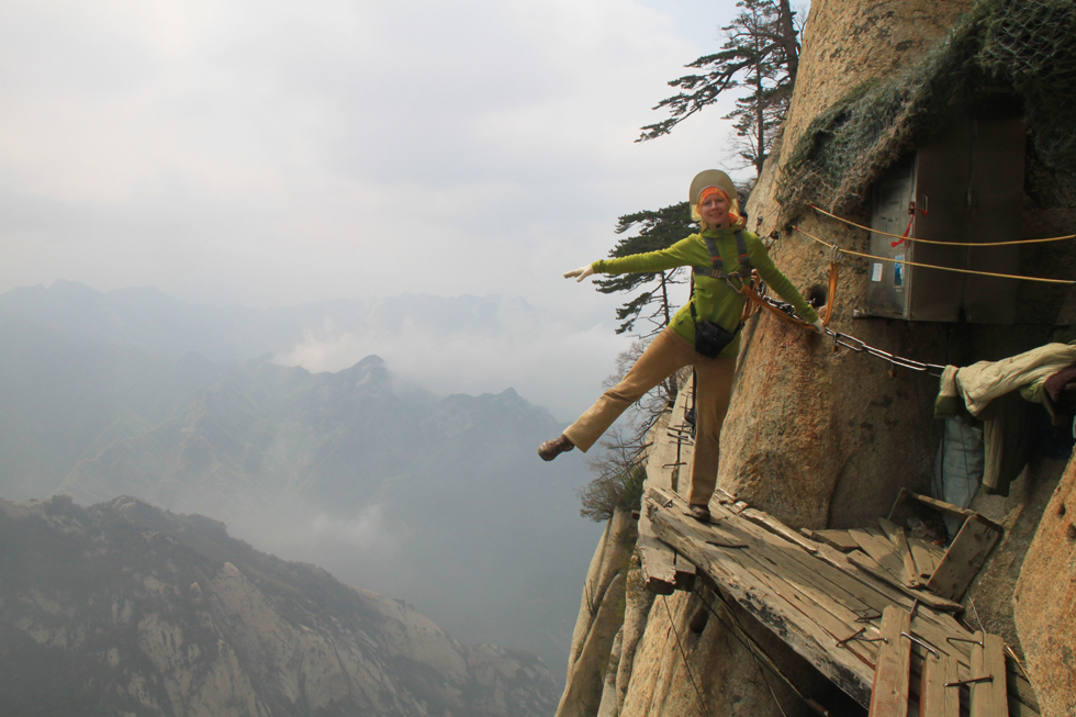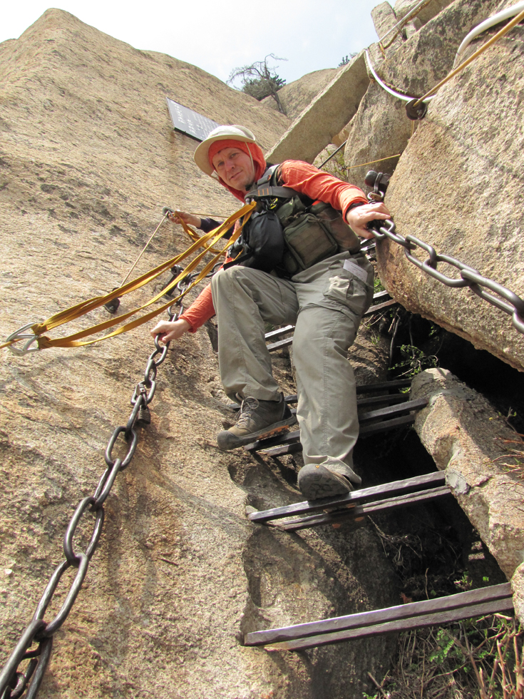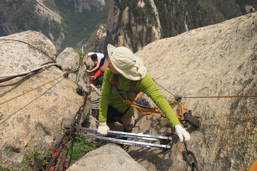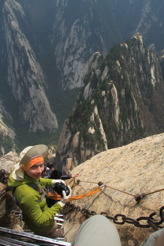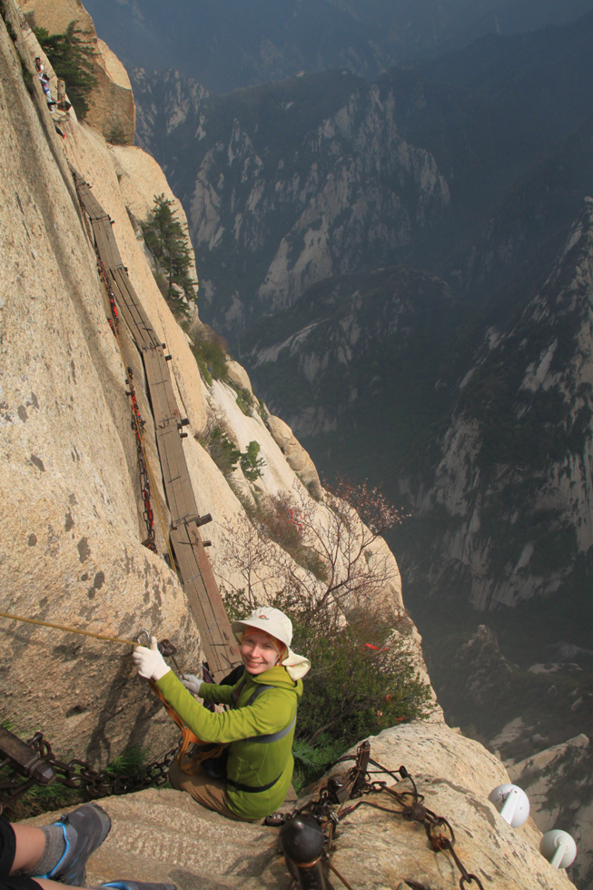 Виа феррата находится между Восточным и Южным пиком и на карте называется «Plank road in the sky». И действительно, на горизонтальной ее части присутствует деревянный настил в виде дощечки. Зимой дорожка закрыта, в непогоду вокруг ничего не видно, в сезон на ней бывает много народу. Ну, когда нас пугали трудности? Погода была неплохая, толпа на вход присутствовала и двигалась очень медленно, но посредине люди волшебным образом исчезали и переставали мешать. Вход на дорожку оплачивается отдельно (30 юаней), в стоимость входит прокат альпинистской обвязки. Перчатки надо брать свои.