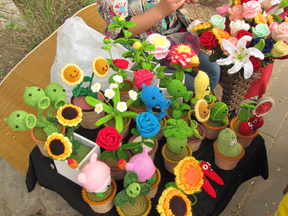 Смешные вязаные цветочки, в двух местах такие продавали.