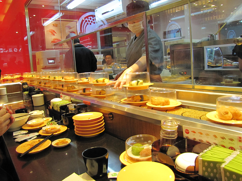 После первой чайной атаки надо было подкрепиться. Ходили на суши-конвейер. Представьте себе: сидите вы за столом, а мимо вас по ленте едут маленькие тарелочки с едой, можно брать все понравившееся. Очень затягивает.