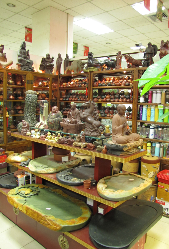 Внизу подносы для чайной церемонии, в середине чайные статуэтки, ну а сзади чайники... чайники... чайники...