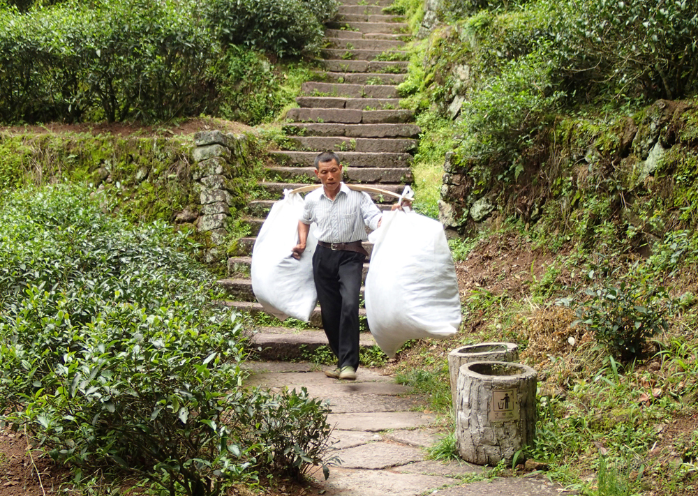 Чай в Уишани собирают вот в такие большие мешки. Ведь веточки для улунов нужны большие, сантиметров 10 длиной, их набирается много.