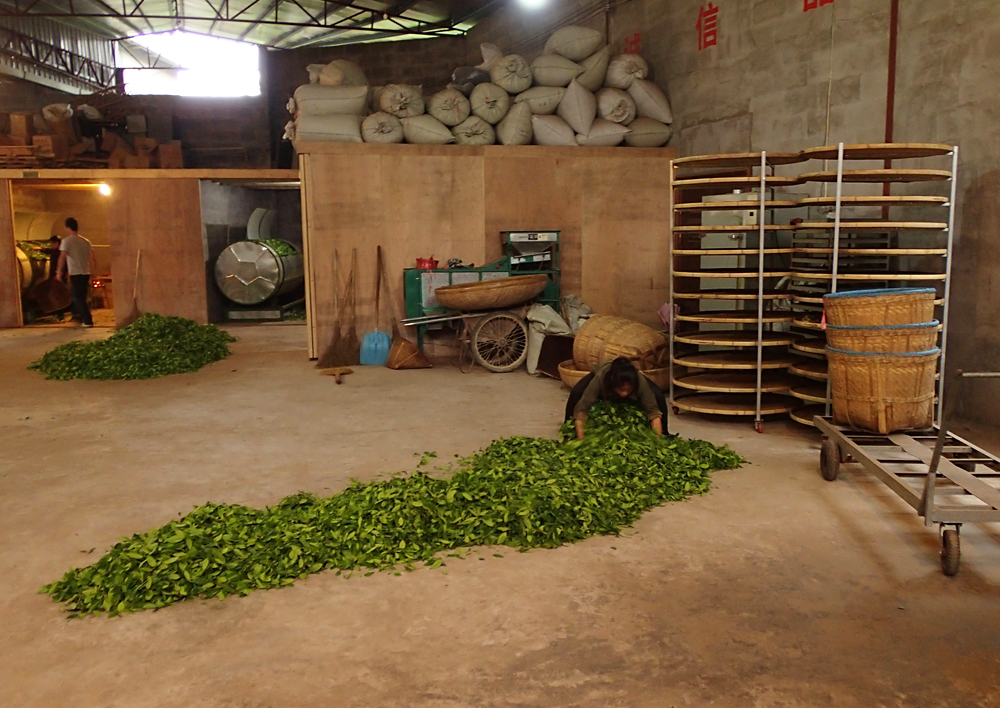 Потом чайный лист прогревают и сушат при температуре 120 градусов и получают полуфабрикат улуна — мао ча. Дальше его будут очищать от веток, сортировать, и дальнейшая обработка займет от 3 до 6 месяцев, так что темные улуны будут готовы только летом или осенью.