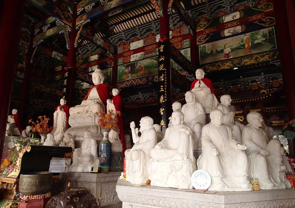 Архаты высечены из бирманского белого мрамора в натуральную величину, их действительно 500, они пронумерованы и рядом с каждым написана история. Только по-китайски, к сожалению. Вот они, в галерее сидят.