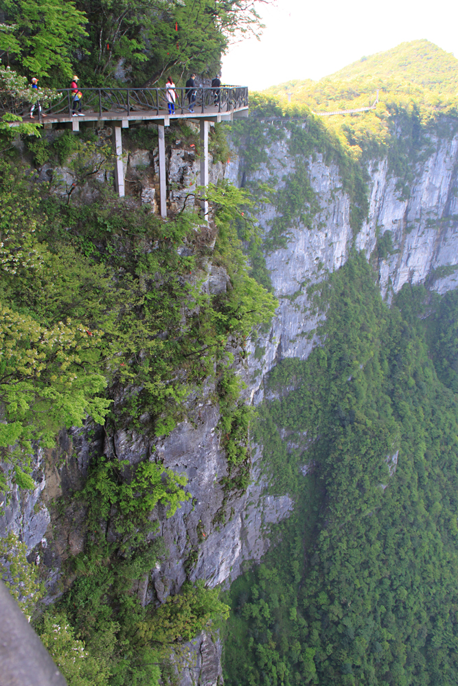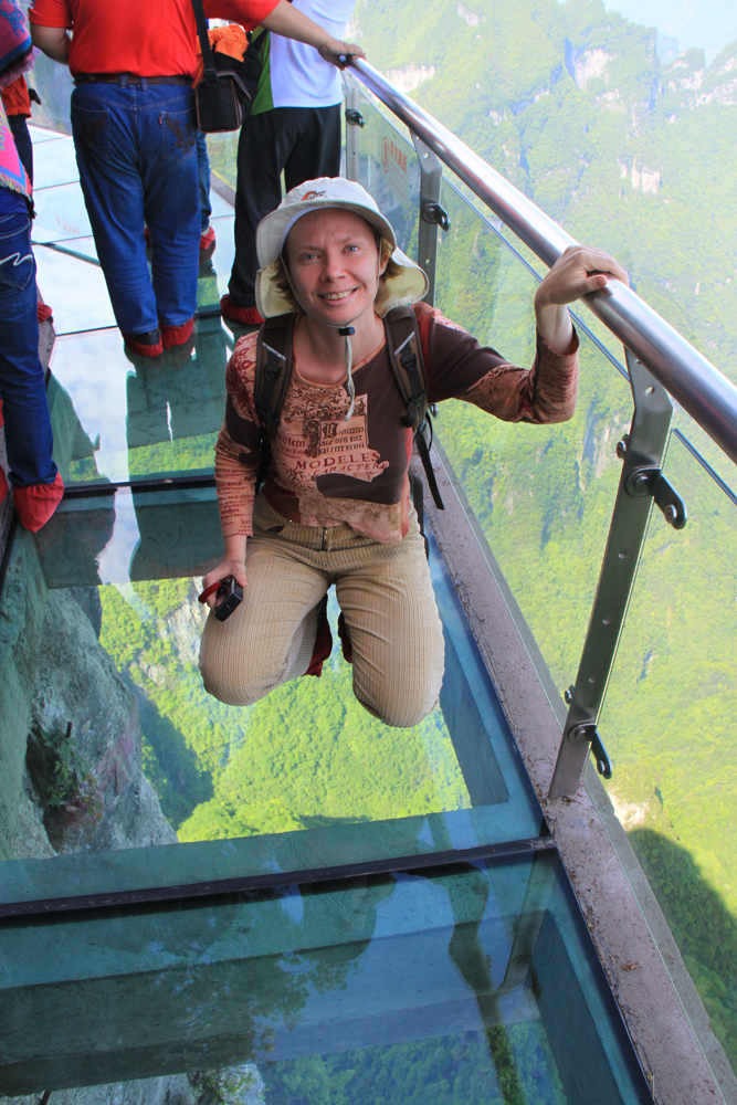 Ты платишь дополнительные пять юаней, на тебя одевают мягкие красные тапочки — и вперед. Многие очень боятся этой дорожки и не могут идти по стеклу. Слева есть каменный карниз сантиметров в 20 шириной, и вот народ к нему прилипает. А мне лишь бы руками было за что схватиться, а так совсем не страшно. Я же понимаю, что остальные дорожки на этой горе так же висят в воздухе на искусственных опорах, как и эта. Ну и что, что вместо камня — стекло...