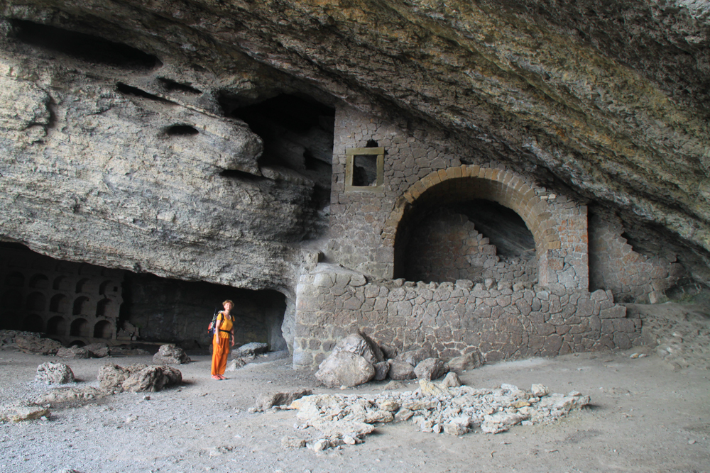 Поскольку тропа перед гротом совсем осыпалась, то в конце все залезают наверх.