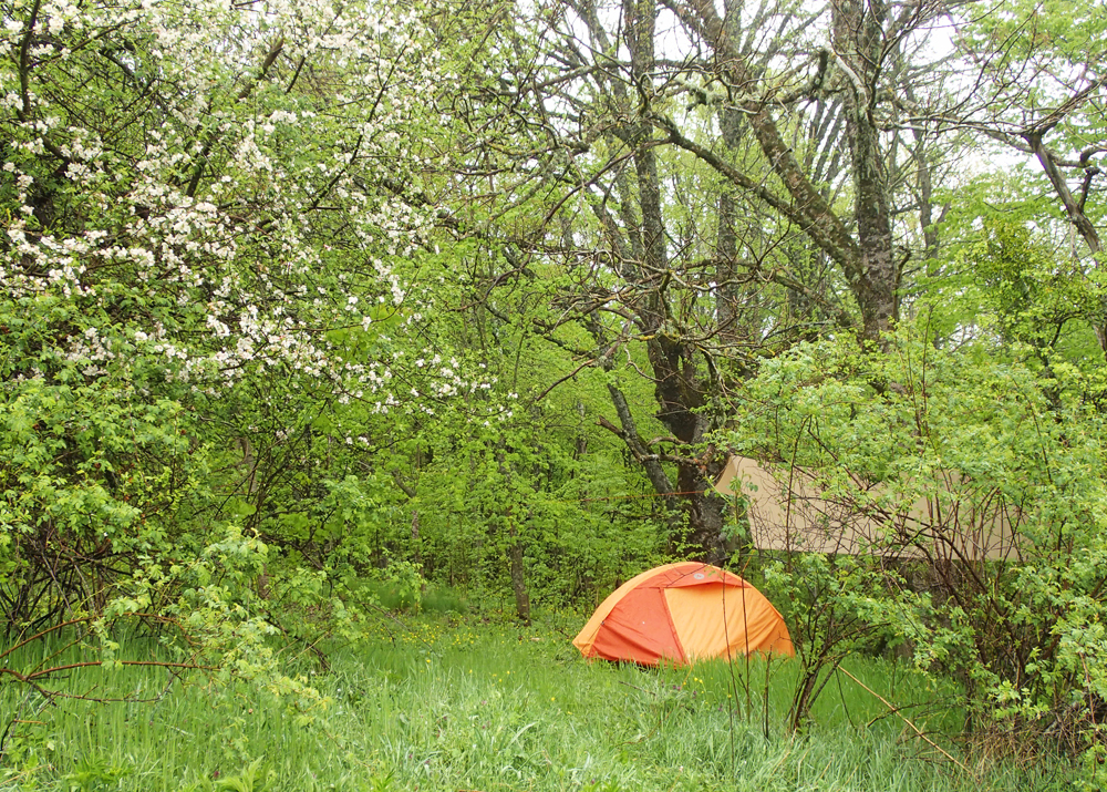 Сама по себе Бойка — неинтересная темная стоянка в лесу. Поэтому мы остановились на опушке, не доходя до нее 200 метров, под цветущим деревом.