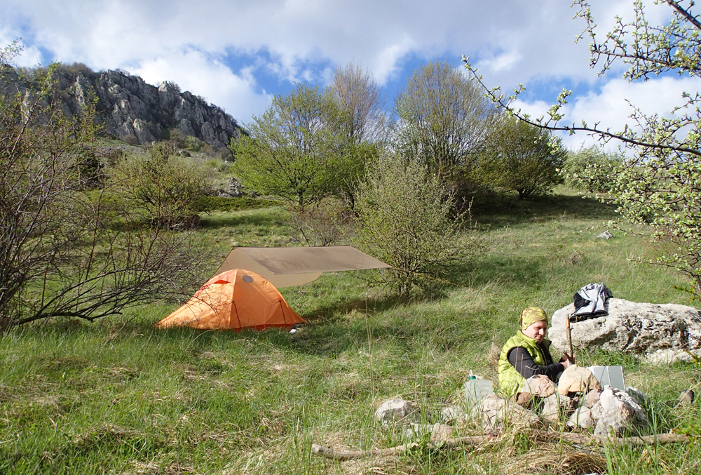 У стоянки Верхняя Джурла мы единственный раз за весь поход увидели замусоренный склон. В остальных местах очень чисто. Трек до водопада Джурла у нас получился всего 7 км, но при этом 700 м вверх и 250 вниз. Не доходя до водопада метров 200, встали на склоне на ровной площадке.