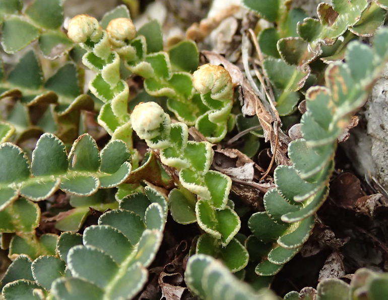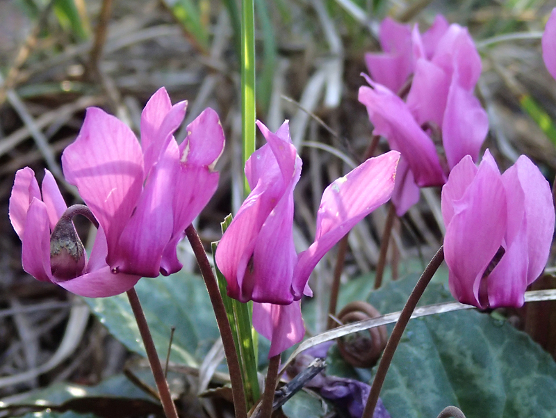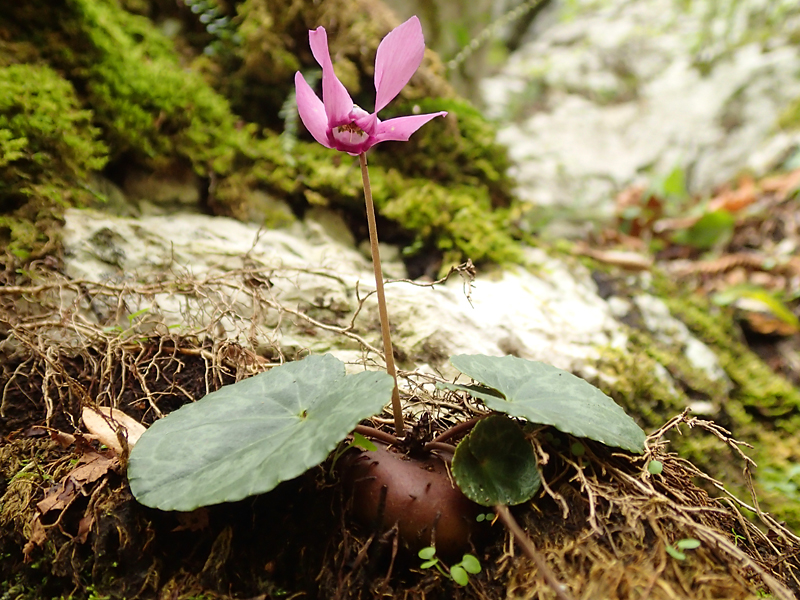 Цикламен растет на камне так, что видна его луковица и вся корневая система.