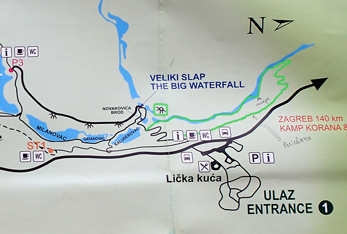 На карте смотровая точка обведена зеленым квадратом. От большого водопада (Velki slap) ведет лестница наверх ущелья, около 200 вертикальных метров. Далее нужно пройти еще немного направо по указателям, мимо деревни. Там тоже наверняка сдается жилье.