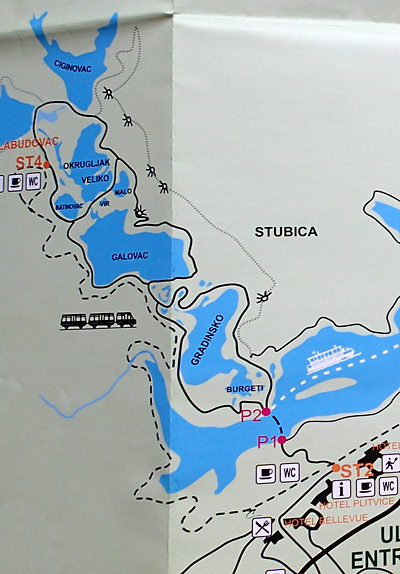 Чтобы попасть к южному каскаду, от второго входа нужно переправиться на пароме (P1-P2). Переправу можно обойти по берегу, но это долго и не очень интересно.