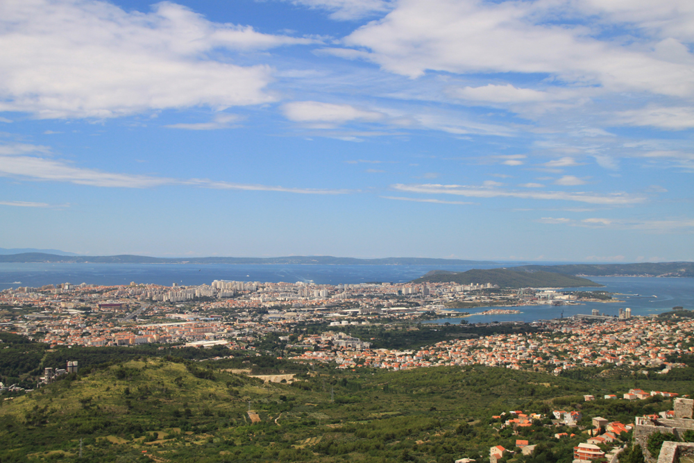 За Сплитом виден пролив, а за ним на горизонте — длинный остров Шолта.