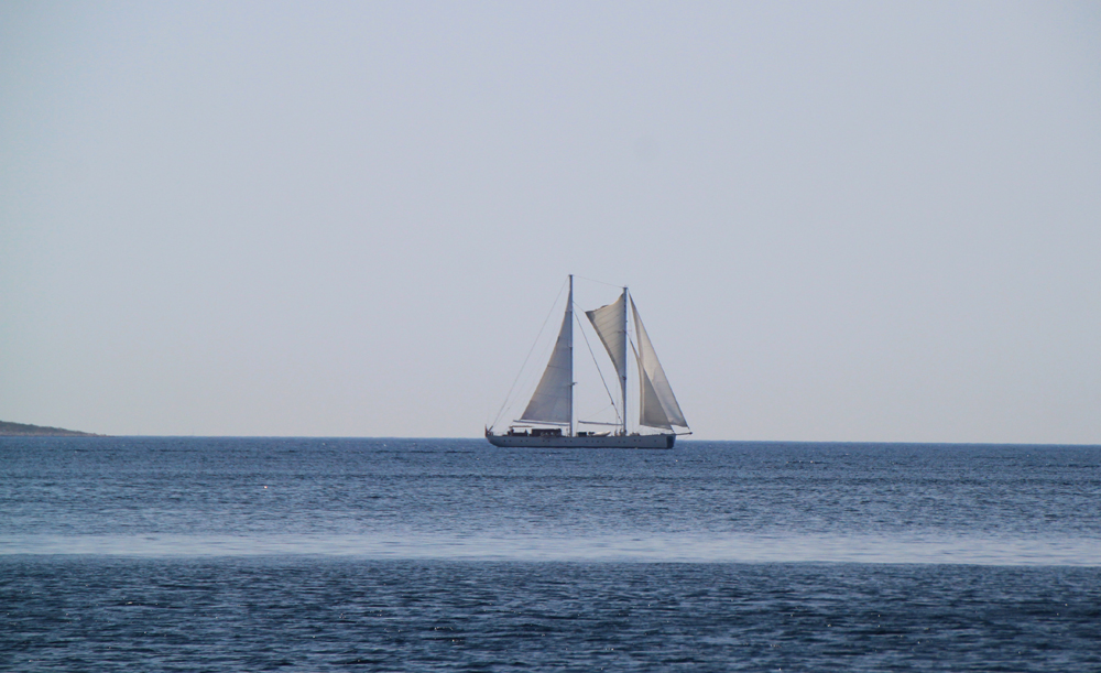 На выходе из залива в 11:15 поставили паруса. Многое забылось, что делать с гротом, я помнила очень смутно, пришлось вспоминать. Хорошо хоть любимый стаксель был прост и понятен. Под парусом в этот день удалось пройти всего два часа, потом ветер стих.