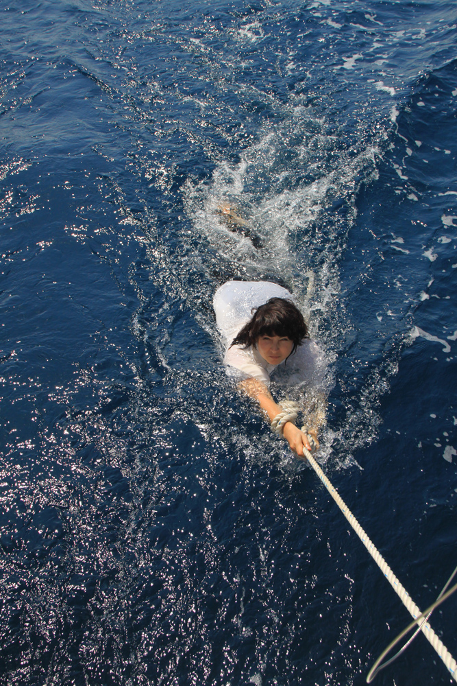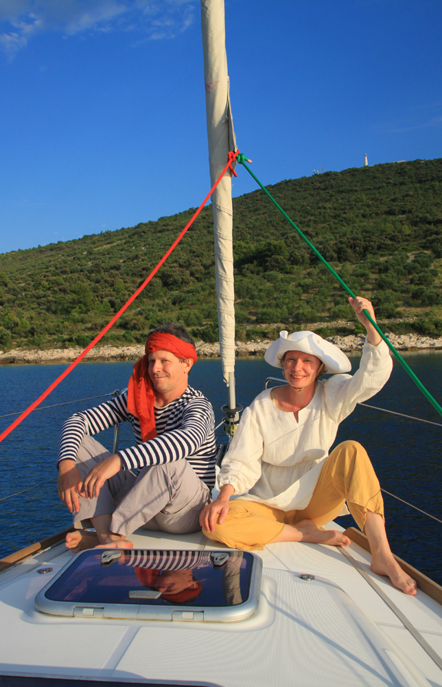 Сами некоторое время боялись так купаться под парусом, вдруг нужно резко делать галс? Но потом тоже осмелели. На моторе надежней, но мотор воняет там внизу, не так романтично получается.