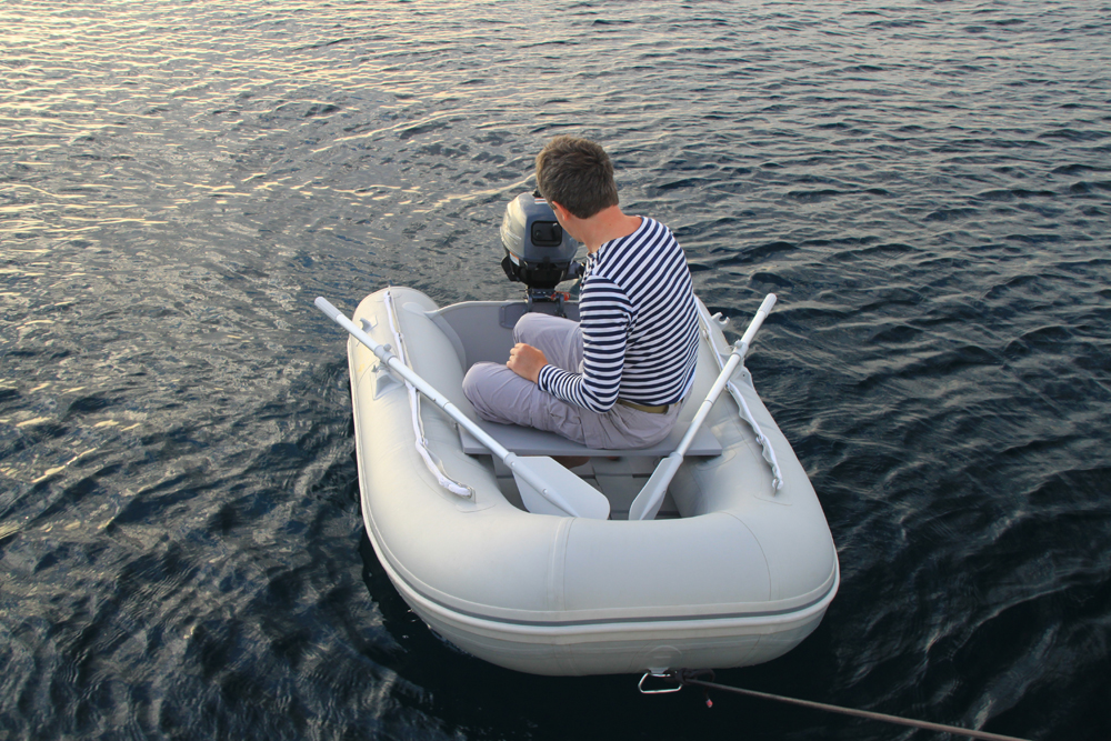 Ближе к вечеру тузик все-таки решили спустить на воду для тренировки. Он занимал довольно много места на баке, мешал открывать иллюминаторы. Многие яхты тащат его за собой, не поднимая на борт. Мы же с возмущением отвергли такой способ транспортировки: и оторваться может, и яхту тормозит, и вообще, выглядит неаккуратно.